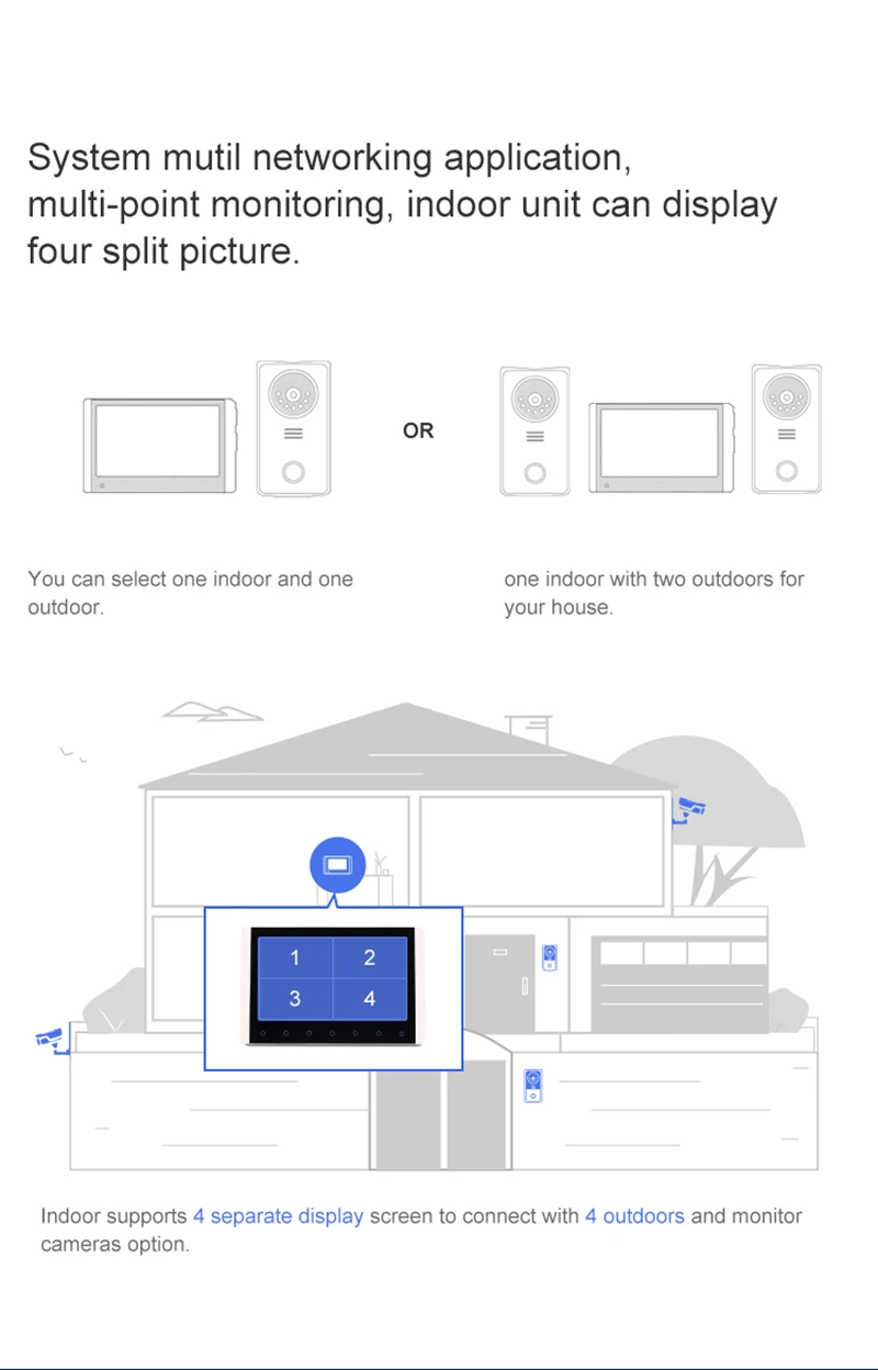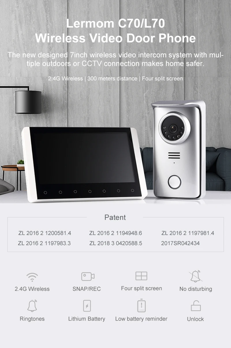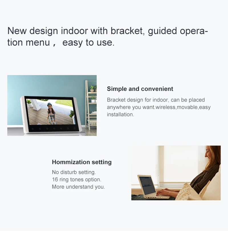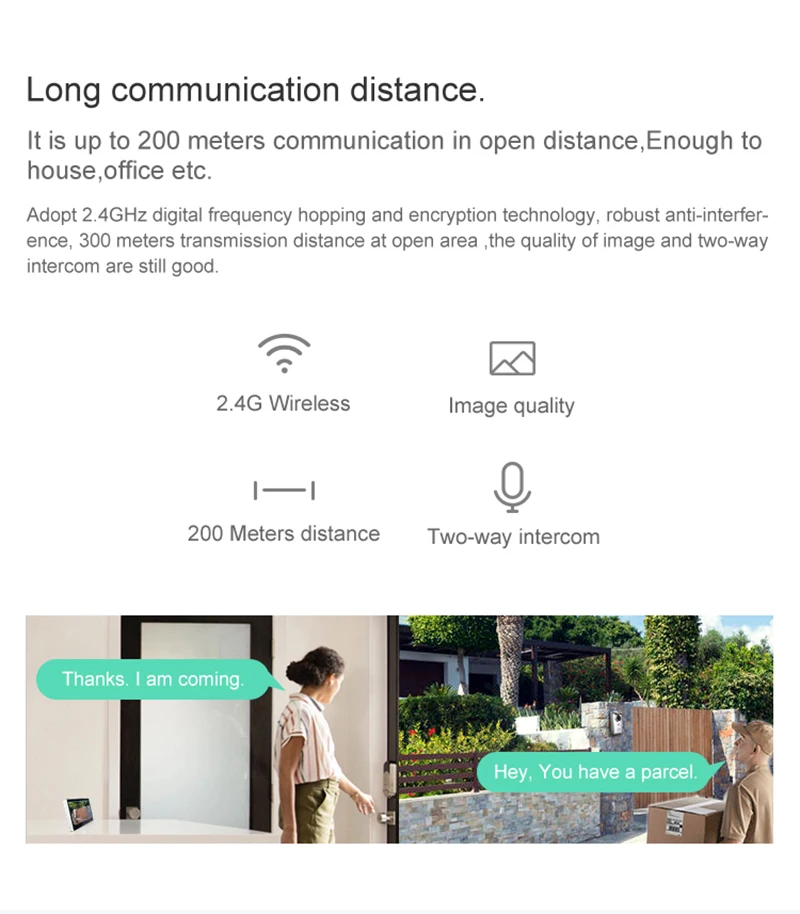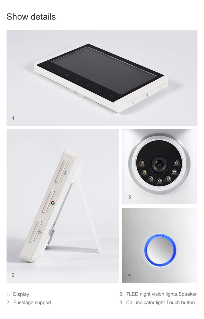 * 2,4 ГГц Частота беспроводного подключения. * 7 дюймов TFT ЖК-дисплей экран. Емкостные сенсорные кнопки. * Вызов посетителей, видеодомофон, разблокировка, напоминание о пропущенных вызовах. * Память о пропущенных звонках с указанием времени и даты. * Фотография/видеозапись/Четыре экрана разделены. * Не тревожный, бесшумный светильник с индикацией. * Позволяет записывать аудио и видео вместо статического изображения. * Поддержка подключения к камере видеонаблюдения (опционально) * 6 шт. IR светодиодный светильник для ночного видения. * Время, яркость и громкость разговора регулируются. * Слот TF для внешней карты объемом до 32 Гб. * Защита от дождя. * 16 полифонических мелодий для опции. * Приложения, такие как виллы, квартиры.