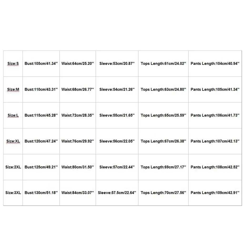| Размеры: 3XL | Обхват груди: 130 см/51,18 дюйма | Талия: 84 см/33,07 дюйма | Рукав: 57,5 см/22,64 дюйма | Длина топа: 70 см/27,56 дюйма | Длина брюк: 109 см/42,91 дюйма |