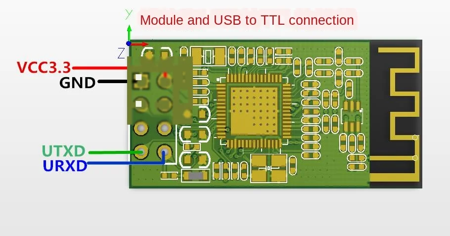 Простой метод испытаний: до тех пор, пока один USB к TTL является 3,3 V,GND,UTXD,URXD, включения питания модуль может работать нормально. Скорость передачи данных в связи с тем, что она дефолтирует до 115200