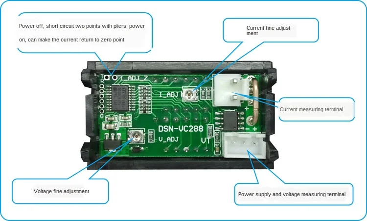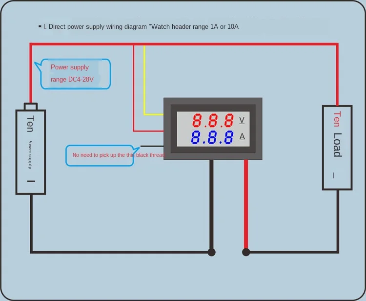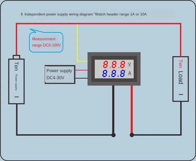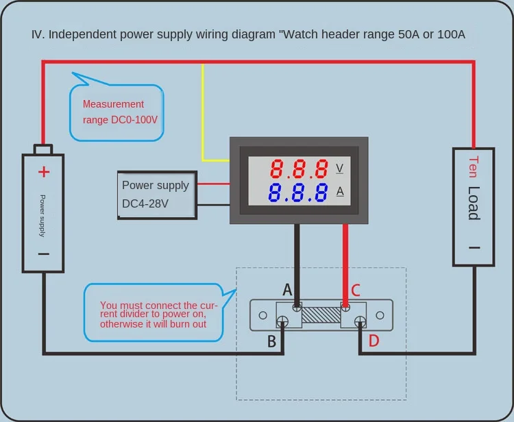 DC0-100V 100A светодиодный двойной дисплей постоянного тока с цифровым напряжением dian liu biao tou с тонкой настройкой Вопросы, требующие внимания:Диапазон 50A или 100A (за исключением 10А) заголовка должен быть подключен к шунту может включаться, в противном случае он сгорит.Технические параметры:Диапазон измерения напряжения 0,0-100 вТестовый диапазон 0-999 мА, 0-10 А, 0-50 А, 0-100 А (4 а диапазон опционально)Диапазон электропитания DC4-30.0VПогрешность напряжения ± 0.1%Ошибка тока ± 1%Технические характеристики внешнего шунта 75 миллиомРабочий ток <20 мАЧастота обновления около 300 мс один разЦифровой светодиодный светильник double three 0,28Цвет дисплея: красный + красный, красный + синий. ОпциональноДлина наконечников 15 смРазмеры 48x29x22 мм Длина X Ширина X Толщина;Установочное Отверстие 46x27 ммВес нетто гВес брутто (г)Рабочая температура-10 ℃ ~ 65 ℃ Не могу ли я считать, что количество отображаемых на дисплее клиентов не допускается: чехол прямого источника питания или автономного источника питания с источником питания оборудования-это земля если тонкая черная линия отключения может быть точной. Физическая карта: