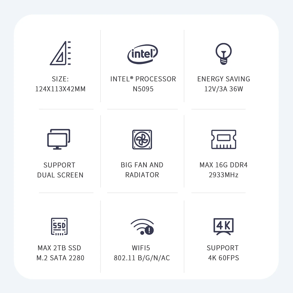 ● Intel Jasper Lake Celeron Processor N5095, 4 core 4 threads,64 bit, 10nm, 2.0GHz up to 2.9GHz, 4M cache