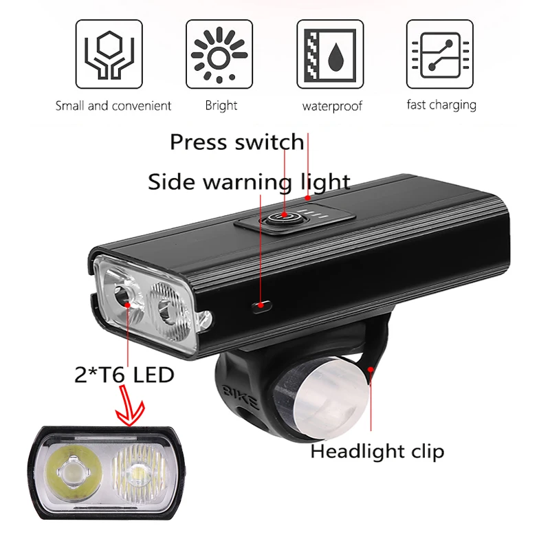 Если вы не используете его в течение длительного времени, пожалуйста, заряжайте его каждые три месяца.Не светится в глаза. Держите подальше от легковоспламеняющихся и взрывоопасных материалов.Класс водонепроницаемости IPX6. Не погружайте велосипедный светильник в воду.Правильно поместите велосипедные фары. Хранить в недоступном для детей месте, чтобы избежать несчастных случаев.Описание:Светодиодный чип: 2 * T6 светодиодныйМатериал: алюминиевый сплавРежимы: 6 режимов (T6 сильный светильник-T6 слабый светильник-T6 сильный светильник-2 * T6 сильный светильник-2 * T6 SOS- 2 * T6 вспышка)Водонепроницаемость: IPX6Люмен: 8000 ЛюменИсточник питания: Встроенный литий-ионный аккумулятор 2000 мАч, безопасный и эффективный.Кнопка: Нажмите кнопкуРазмер: 6,5*3,7*2,5 смМетод зарядки: зарядка через Micro-USBХарактеристики: дисплей питания, боковой светильник Предупреждение ломВремя зарядки: около 3-5 часовПоверхность: износостойкое анодированиеОсобенности:Не только велосипедный светильник, это также флэш-светильник.Алюминиевый сплав, хорошая теплоотдача.IPX6 Водонепроницаемый. Не замачивайте велосипедный светильник в воде.Прочный/анти-осенний, длинный диапазон.Встроенный аккумулятор, зарядка через USB, аккумулятор большой емкости.Автоматическое выключение после завершения зарядки.Высокая яркость, низкое энергопотребление.Легко устанавливается, не скользит.Смотрите так же другие товары:
