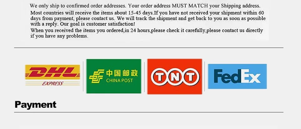 1. Мы обычно отправляем товары в течение 2-7 дней после подтверждения оплаты. 2. Пожалуйста, убедитесь, что ваш адрес доставки верен. 3. Время доставки зависит от сезона, места назначения и других факторов, для рабочих дней, доставка может задержаться. Налоговая информация: -Покупатель несет ответственность за налоги, взимаемые в их стране. Если вам нужен какой-либо документ для оформления, пожалуйста, свяжитесь с нами. Отзывы: Мы будем очень признательны, если вы оставите нам 5 звезд отзывы. Если у вас есть какие-либо проблемы с товарами или услугами, пожалуйста, свяжитесь с нами, прежде чем оставить отрицательный отзывы. Мы постараемся сделать все возможное, чтобы решить проблемы для вас. Спасибо. Следуйте за нами, чтобы получить дополнительную скидку фанатов и больше новых товаров для доставки!
