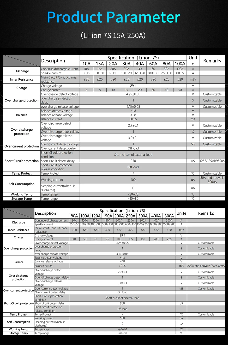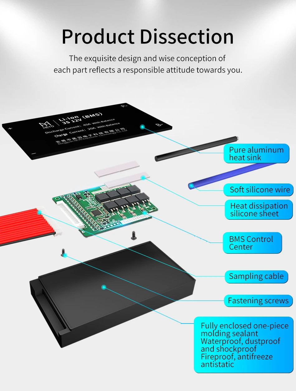 2. Преимущество ◆используйте высококачественный (A-level) защитный интегральный схемы IC, от решения Seiko из Японии. ◆Сильная способность к нагрузке, постоянная разрядка тока 10A/25/35A/45A/60A, использование высоковольтного сопротивления, низкое внутреннее сопротивление мощности Mosfet. Теплоотвод значительно поможет охлаждению. Сам ◆IC имеет функцию балансировки мощности. Схема проста и надежна. ◆Типичное Обнаружение напряжения для каждой ячейки. Таким образом, каждый аккумулятор будет предотвращен из-за заряда или разрядки. Функция защиты от перегрузки по току и короткого замыкания очень надежная. Долгое время короткого замыкания нагрузки не повлияет на печатную плату и батарею. Защита от температуры во время зарядки и разрядки. ◆Extreme низкая потребеление энергии. Потребление всего устройства составляет менее 50uA. ◆PCB использует высокие антикоррозийные, Высокая водонепроницаемость, высокое сопротивление ОУР Формальное покрытие.