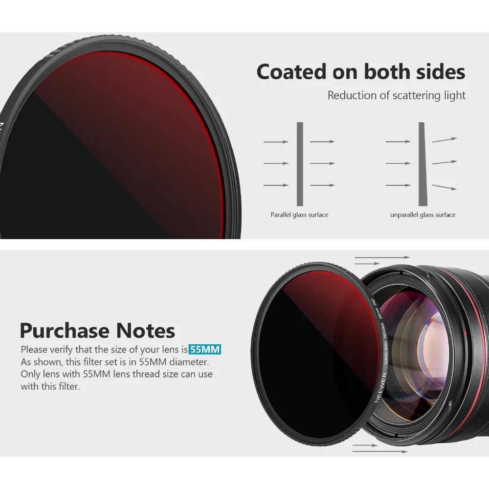 Фильтр Neewer 55 мм Pro ND1000 может уменьшить количество света на 10 стоп и обеспечивает только 0.1% пропускание света. Водонепроницаемость, многослойное покрытие и устойчивость к царапинам.