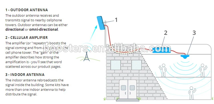• Внешняя антенна улавливает Низкий сигнал с мобильной базовой станции и доставляет его на сотовый телефон