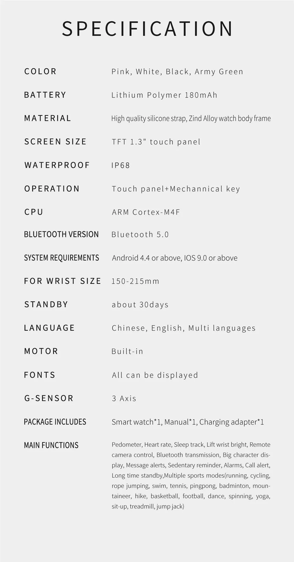 ЦП: ARM, Cortex-M4F Версия Bluetooth: BT 4,0 Совместимая ОС: Android 4,4 или выше, iOS 9,0 или выше Режим работы: Full Touch Водонепроницаемый: IP68 Размер экрана: 1,3 дюймов полный сенсорный экран Разрешение: 208*240 пикселей Емкость аккумулятора: 150 мАч Время в режиме ожидания: около 6-8 дней Время использования: около 3-5 дней Время зарядки: около 4 часов Тип зарядки: зажим для зарядки