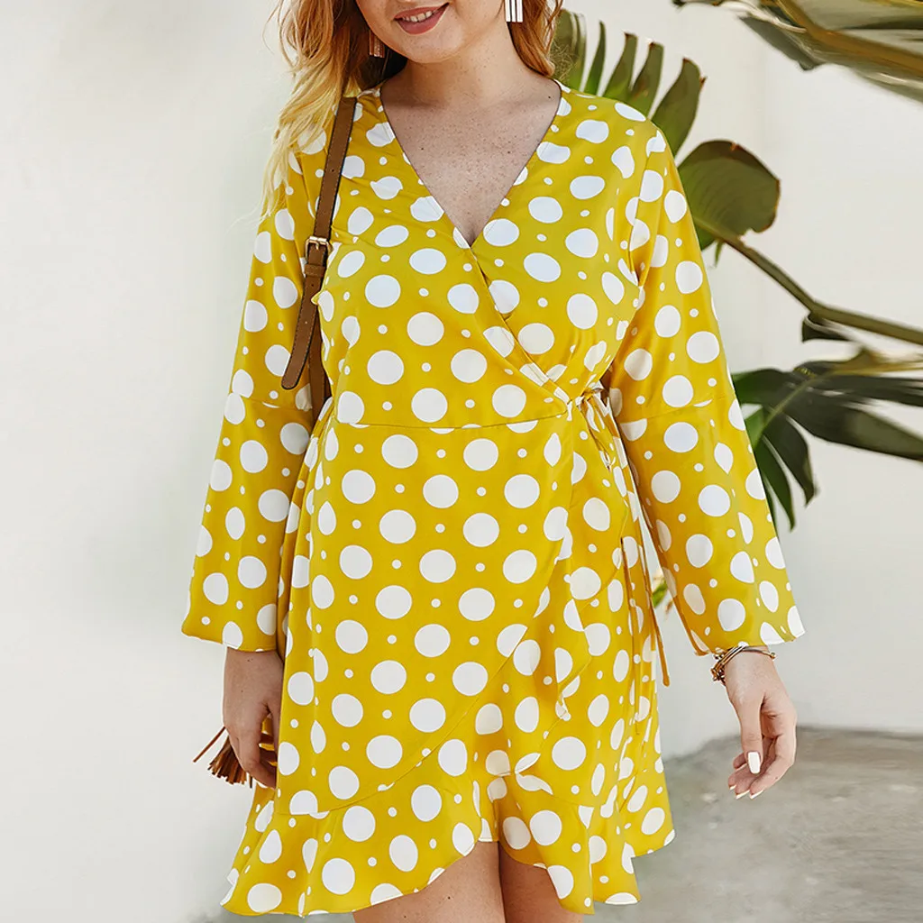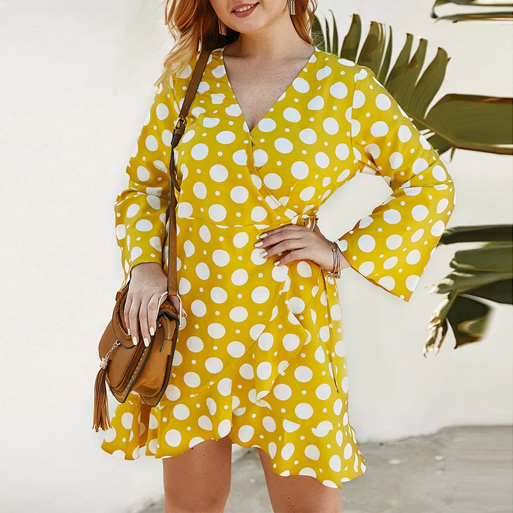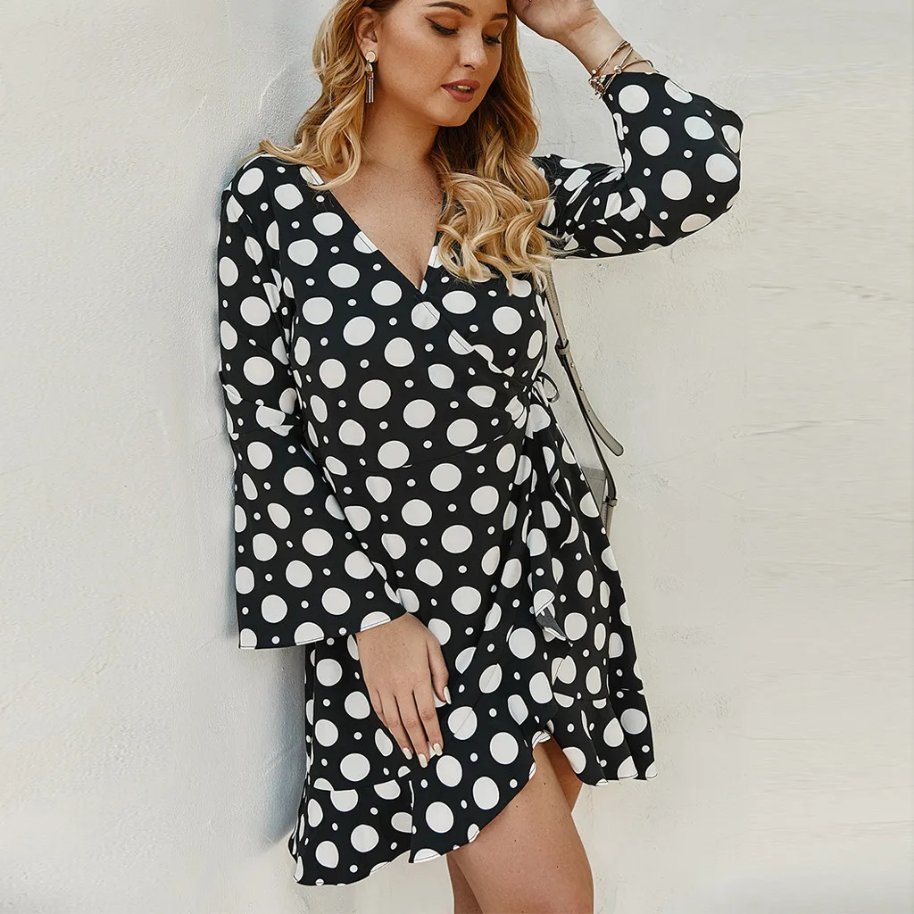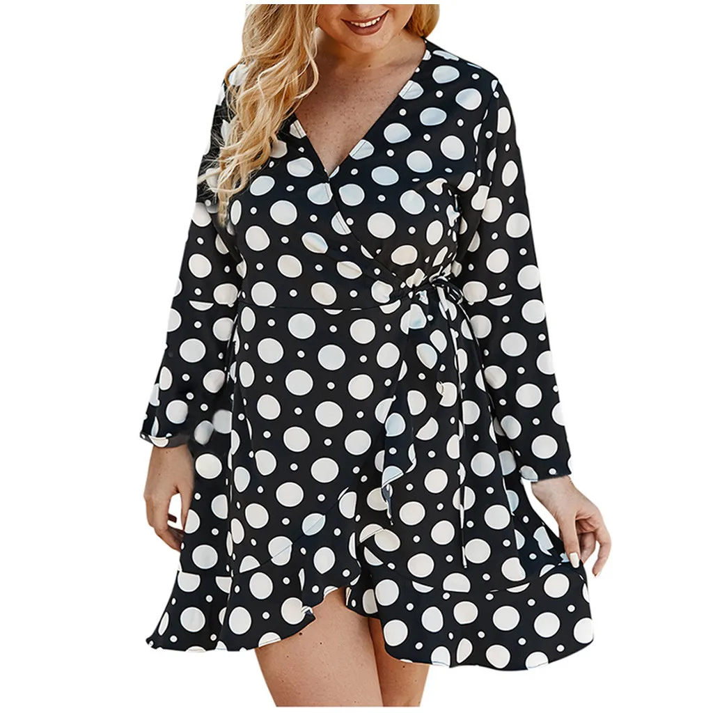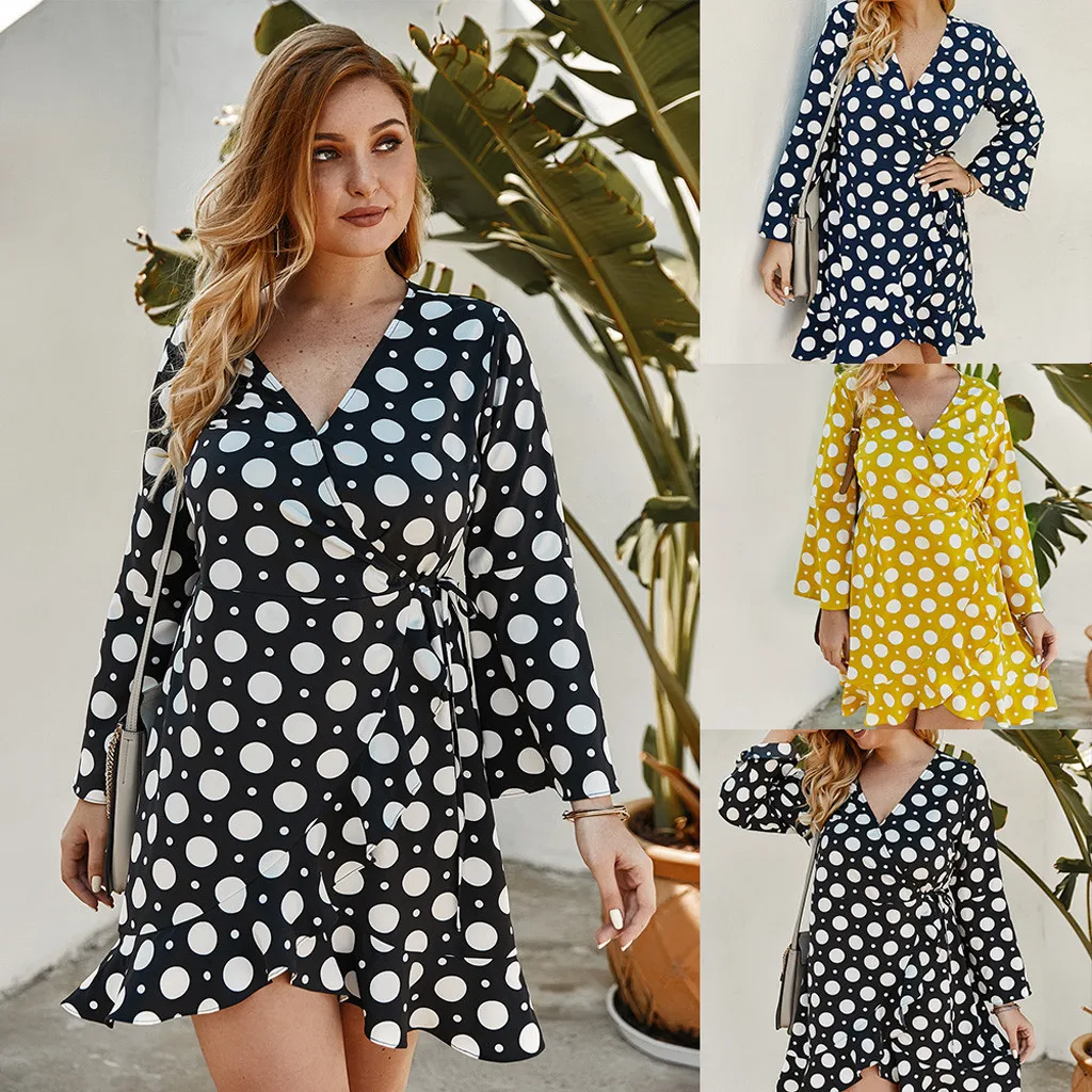 Женское модное Повседневное платье-сарафан в горошек с длинным рукавом и v-образным вырезом