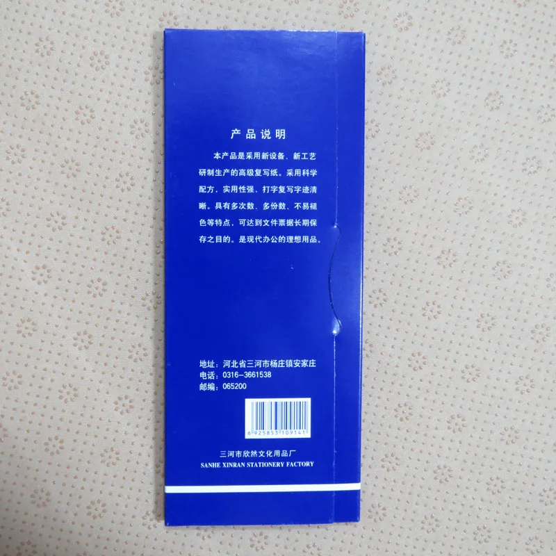 Цвет: черный Размеры: 22*8,5 см Количество: 100 шт Этот продукт использует новое оборудование и новые технологии для разработки и производства многоцелевой дублирующей бумаги с белыми краями, которые не грязные, удобные и практичные в использовании; Он принимает научную формулу, обладает высокой практичностью, четким набором текста и дублированием следов, аккуратный и чистый, и не легко окрашивать ноги, И может храниться в течение длительного времени.