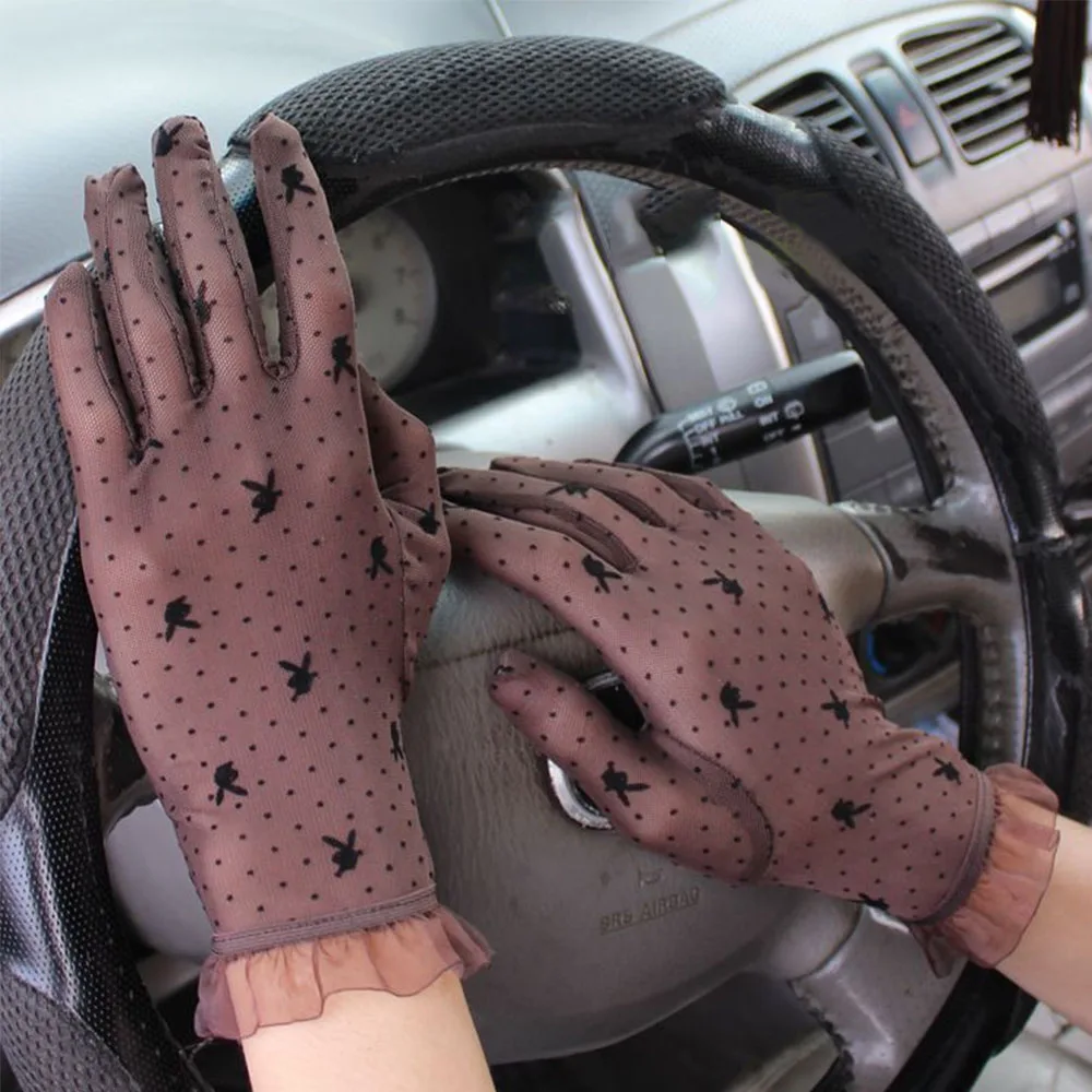 Летние женские тонкие черные сексуальные кружевные солнцезащитные анти-УФ варежки с милым Кроликом, сетчатые дышащие перчатки для езды на велосипеде