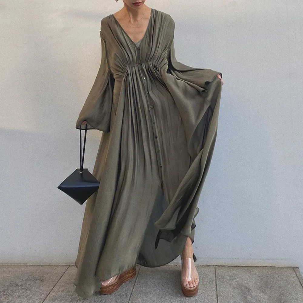 Женское платье с длинным рукавом в Корейском стиле, осень-лето 2020, v-образный вырез, повседневное ТРАПЕЦИЕВИДНОЕ ПЛАТЬЕ С Высокой Талией, плиссированное длинное платье макси, офисные женские платья