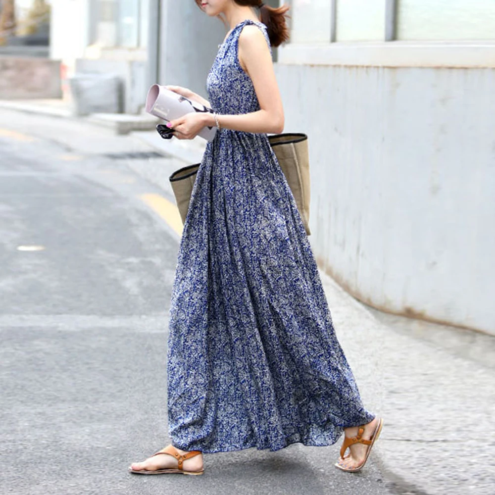 Корейское Длинное Платье женское богемное винтажное платье макси без рукавов с цветочным принтом повседневное летнее свободное платье размера плюс Vestidos