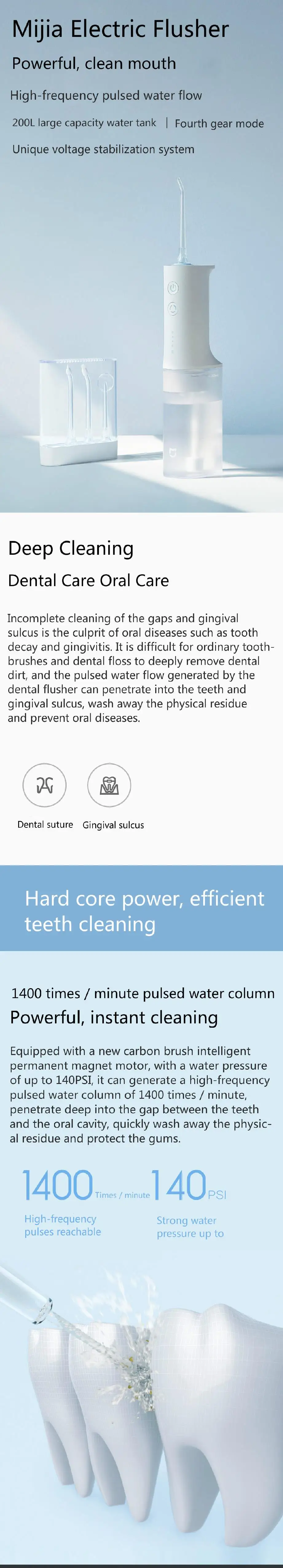 Для обычных зубных щеток и зубной нити трудно глубоко удалить зубную грязь, а импульсный водный плуг, питаемый зубной флушером, может проникать в зубы и gingical sulcus,