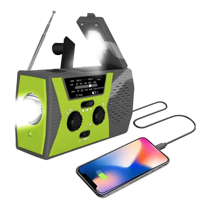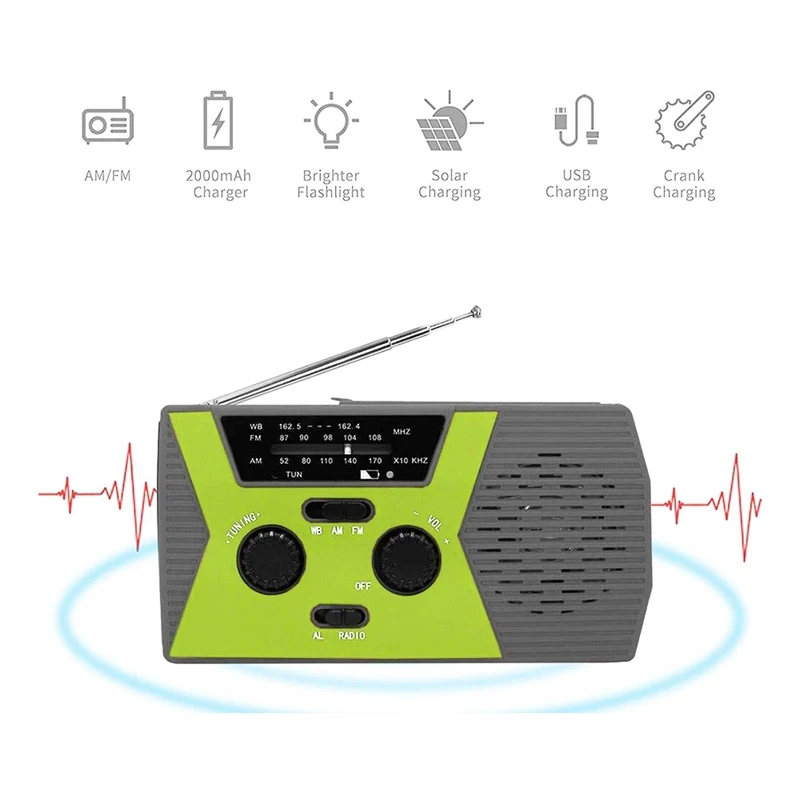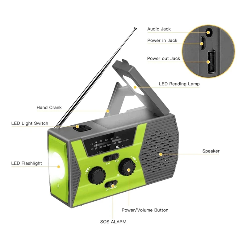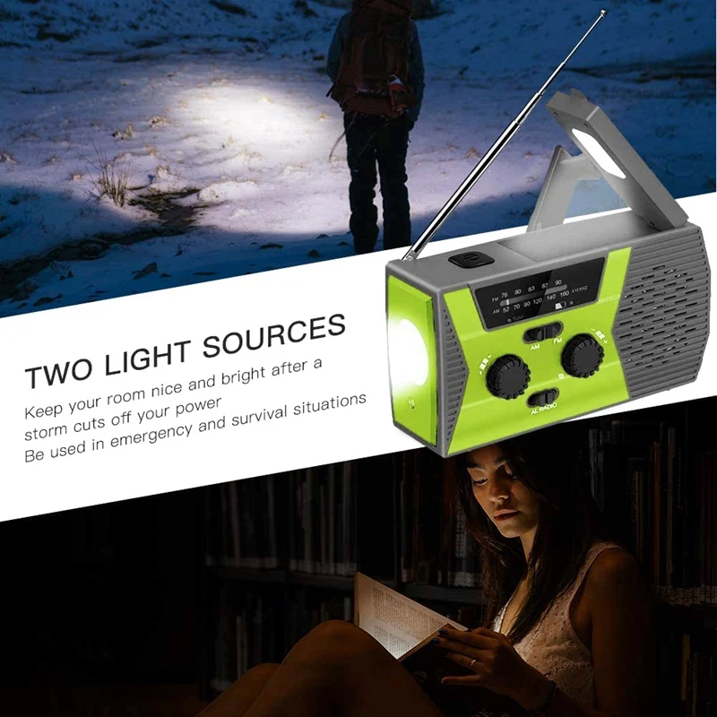 Многофункциональное радио: 2000 мАч большая емкость банка питания, обеспечивая питание маленького планшета или телефона. 6 светодиодный светильник для чтения, 1 Вт флэш-светильник и тревога SOS, быть с вами в кемпинге, альпинизме, походах или любых других видов активного отдыха