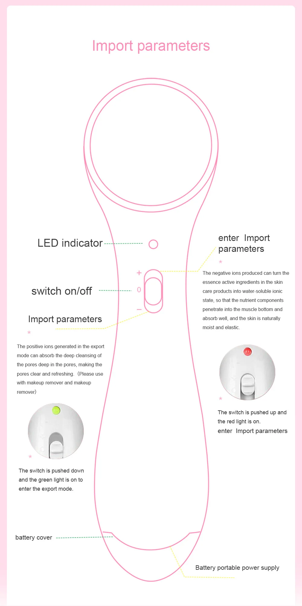 1. Нажмите выключатель питания до "+" положения, светодиодный свет становится красным, продукт начинает вибрацию, 2. Между тем, положительный ион комбинирует очищающее средство для лица может быстро очистить поры грязи, решить и высвобождать остатки метаболизма и улучшить Пигментация, очищение изнутри и снаружи, восстановление пор проникают и комфорт 3. Нажмите выключатель питания до "-" положения, светодиодный свет становится зеленым, продукт начинает вибрацию, между тем, отрицательный ион будет импортировать кожу Защита питания в слой кориума, ремонт сломанных волокон, помочь клеточным поглощать питательную эссенцию, наносить кожу непрерывной новой клеткой, а затем получить эффект красоты