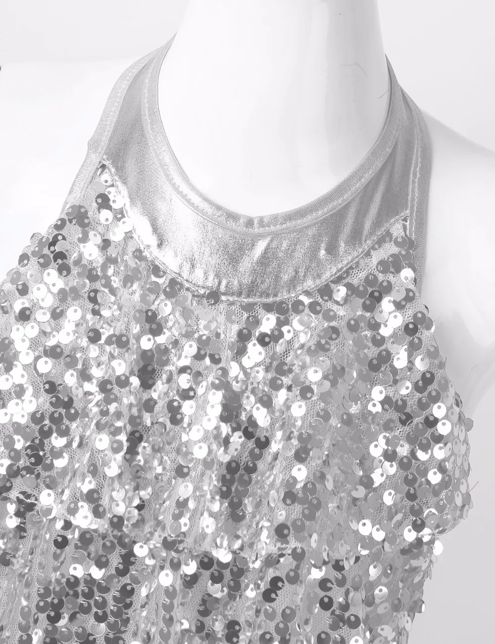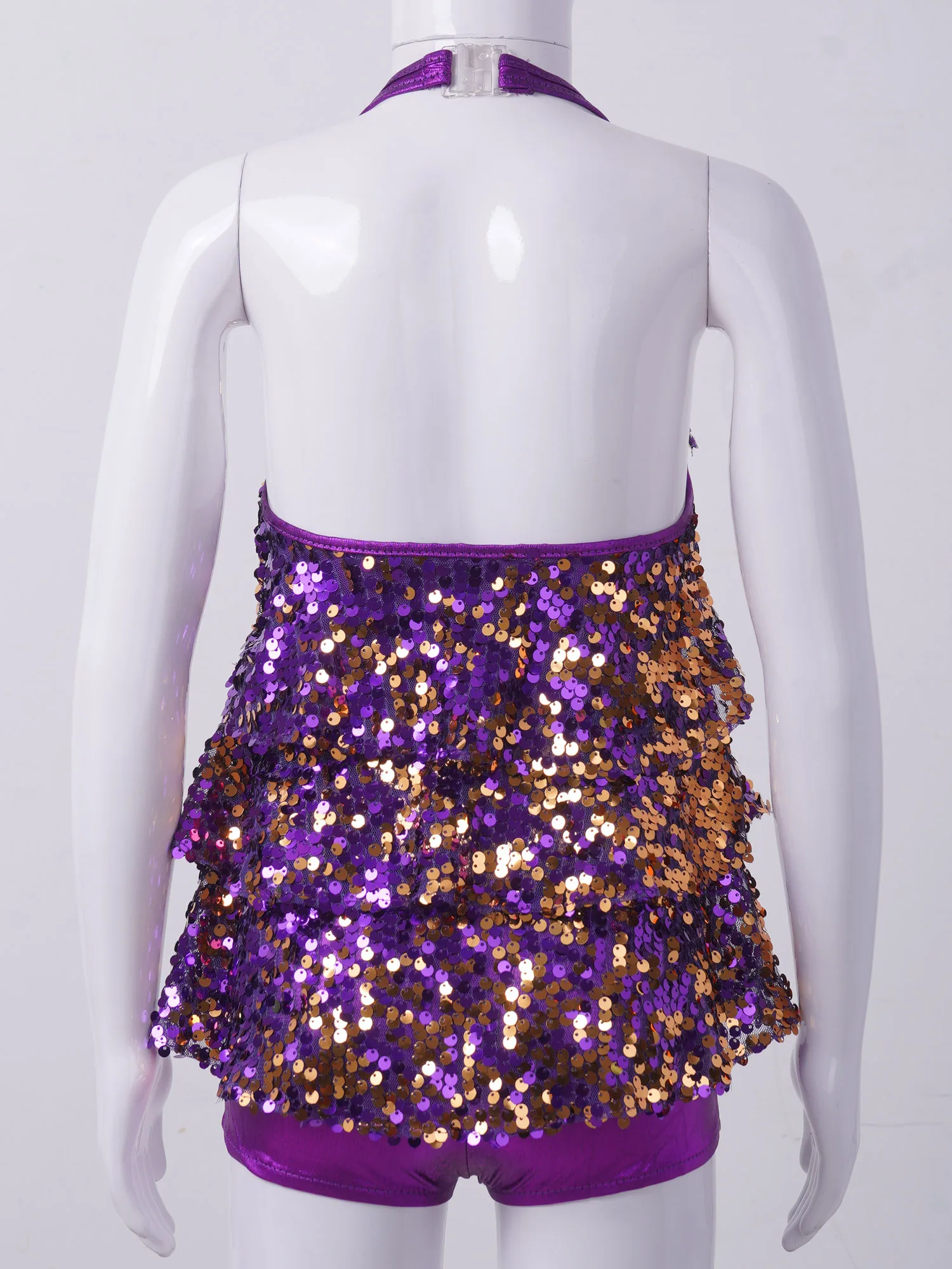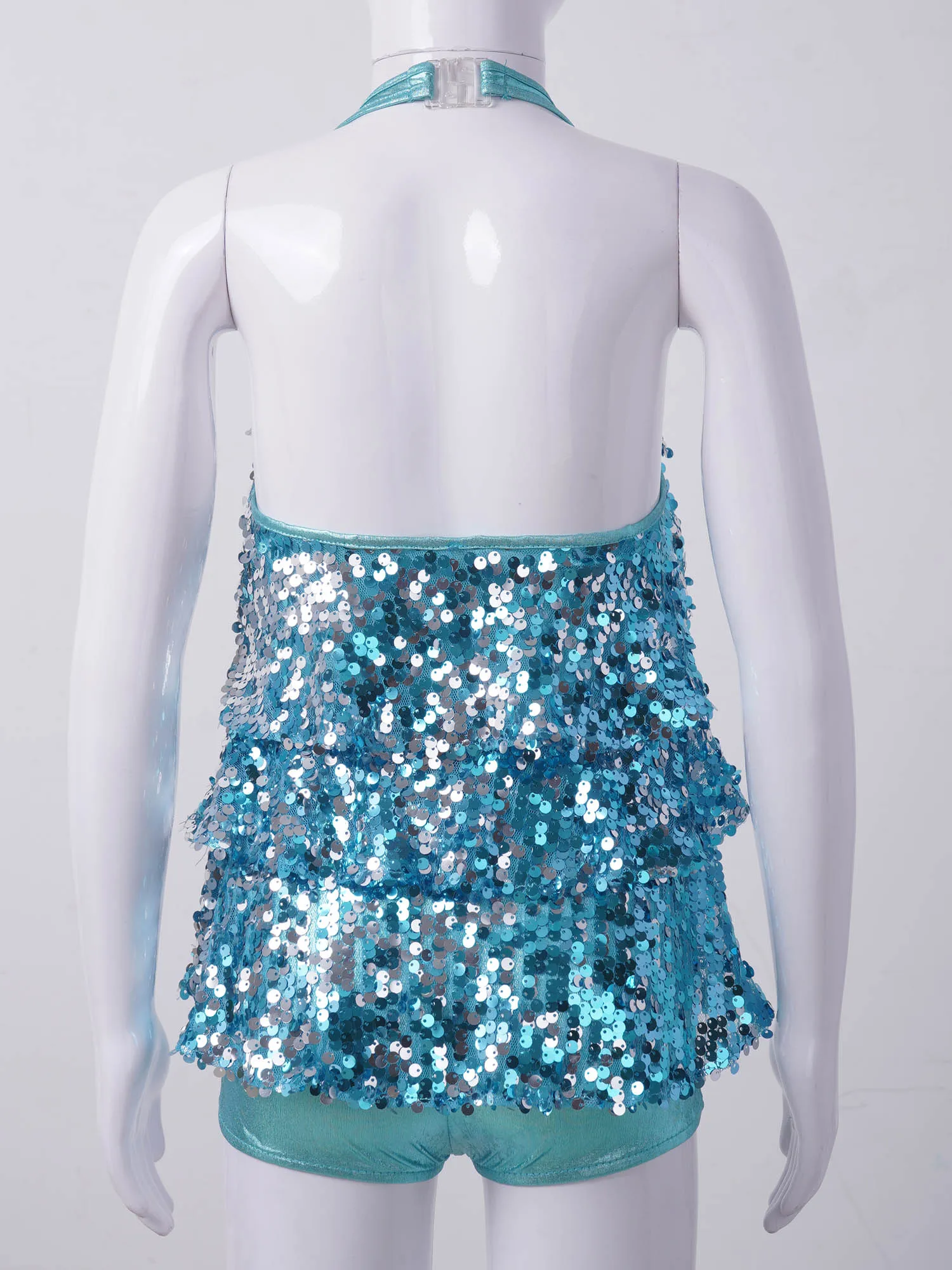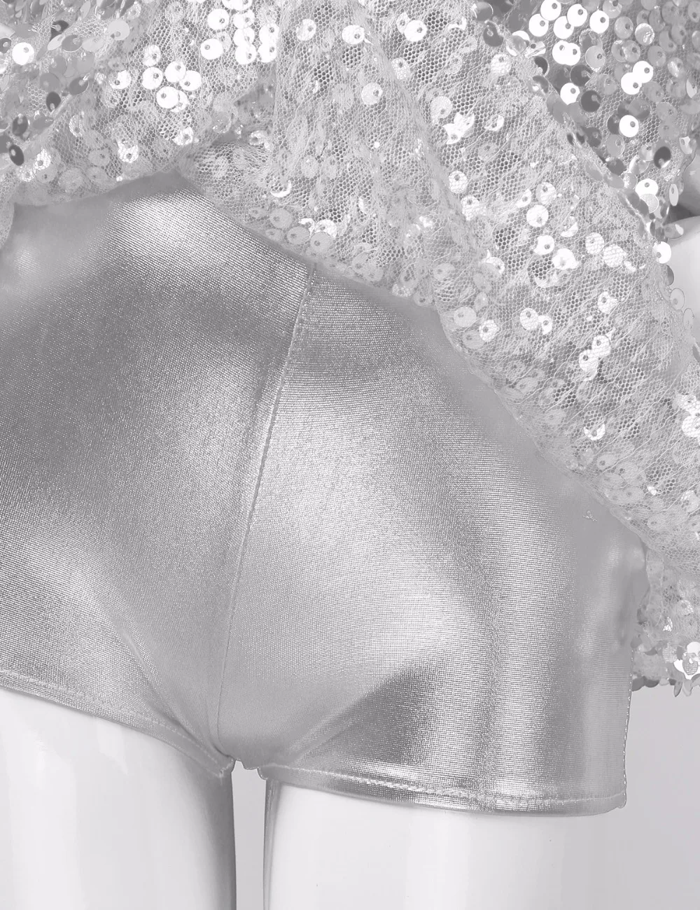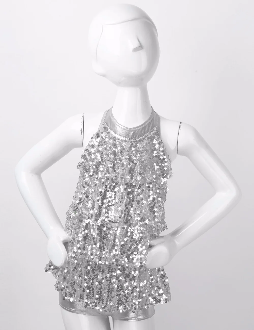 1 многослойная юбка с баской, расшитая блестками, на талии. Встроенные шорты с металлическим отливом. Стильная, красивая и блестящая Одежда для танцев для вашей девочки.