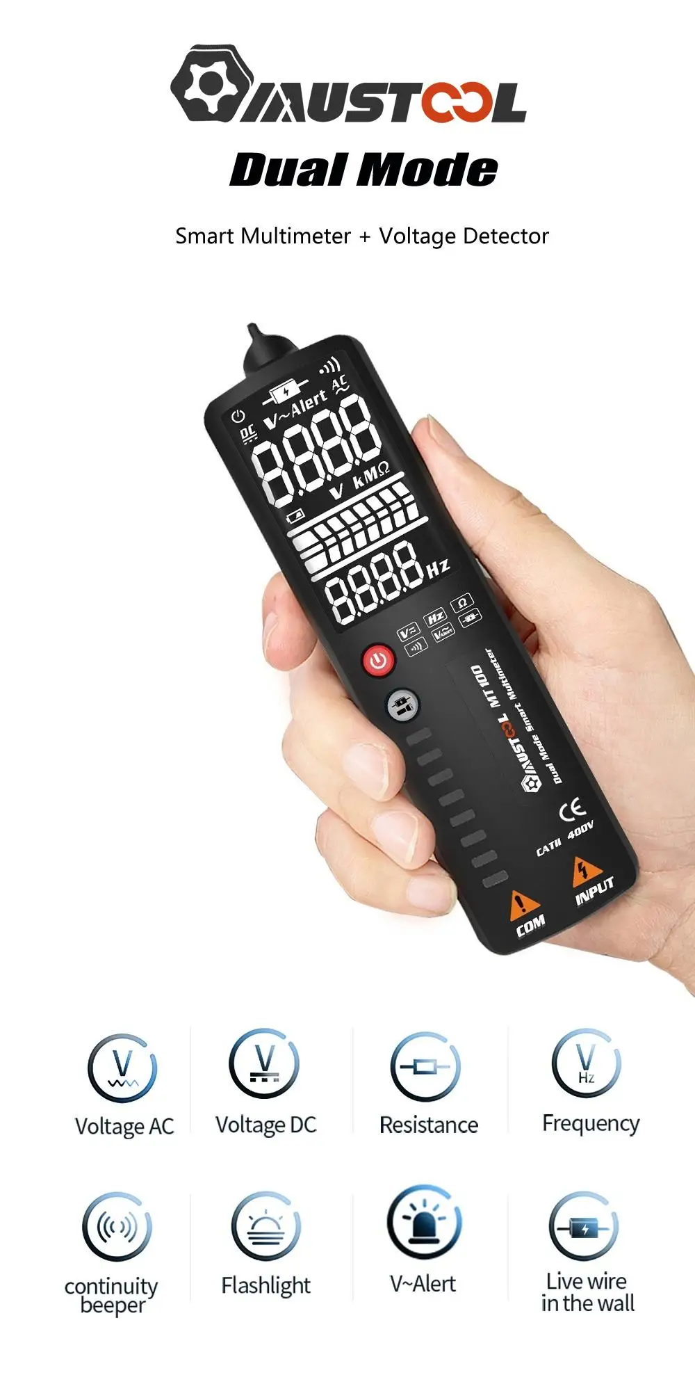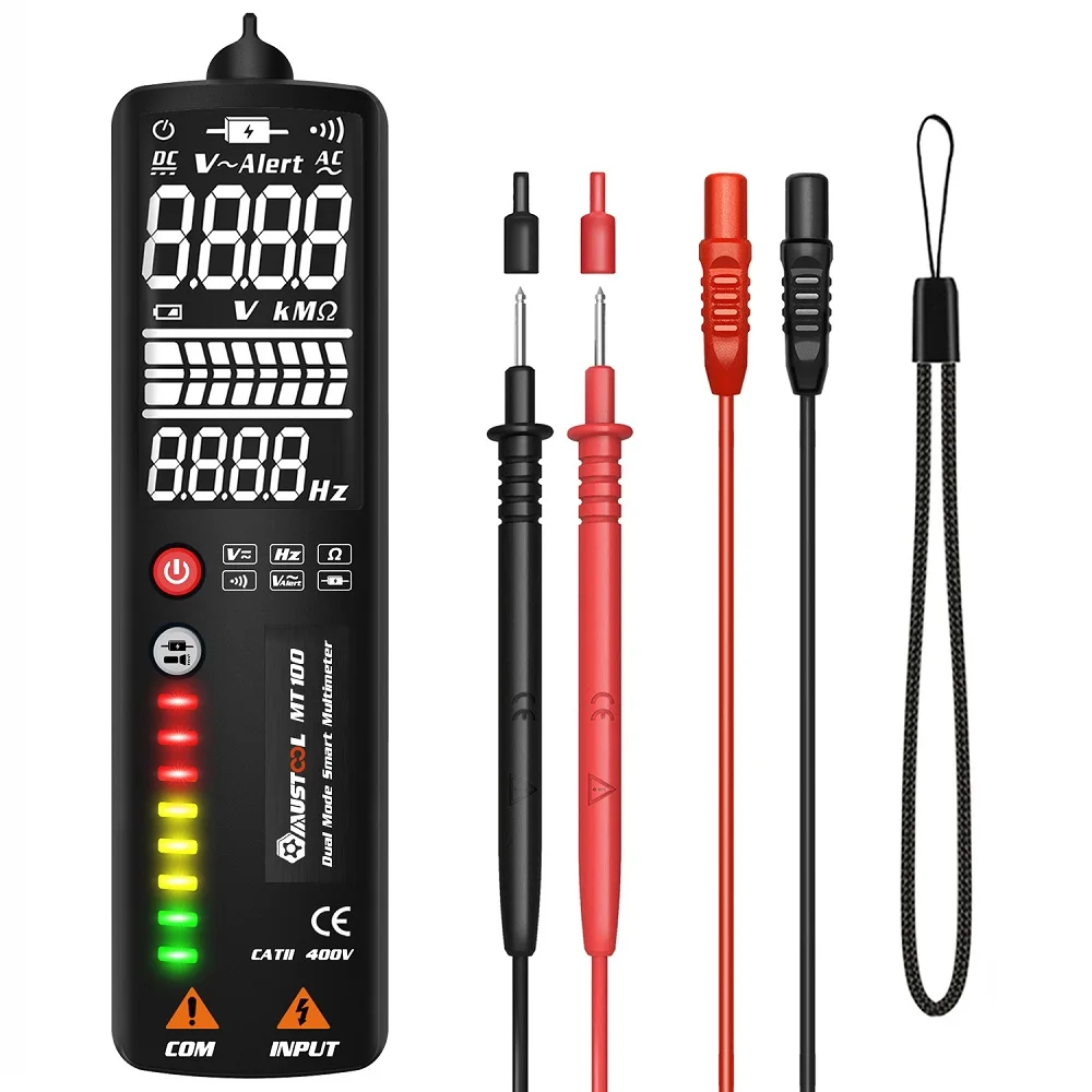 [Автоматическая идентификация]: Разработанный с помощью умной технологии MUSTOOL для начинающих, этот мультиметр может автоматически идентифицировать протестированные параметры и выбрать требуемое снаряжение.