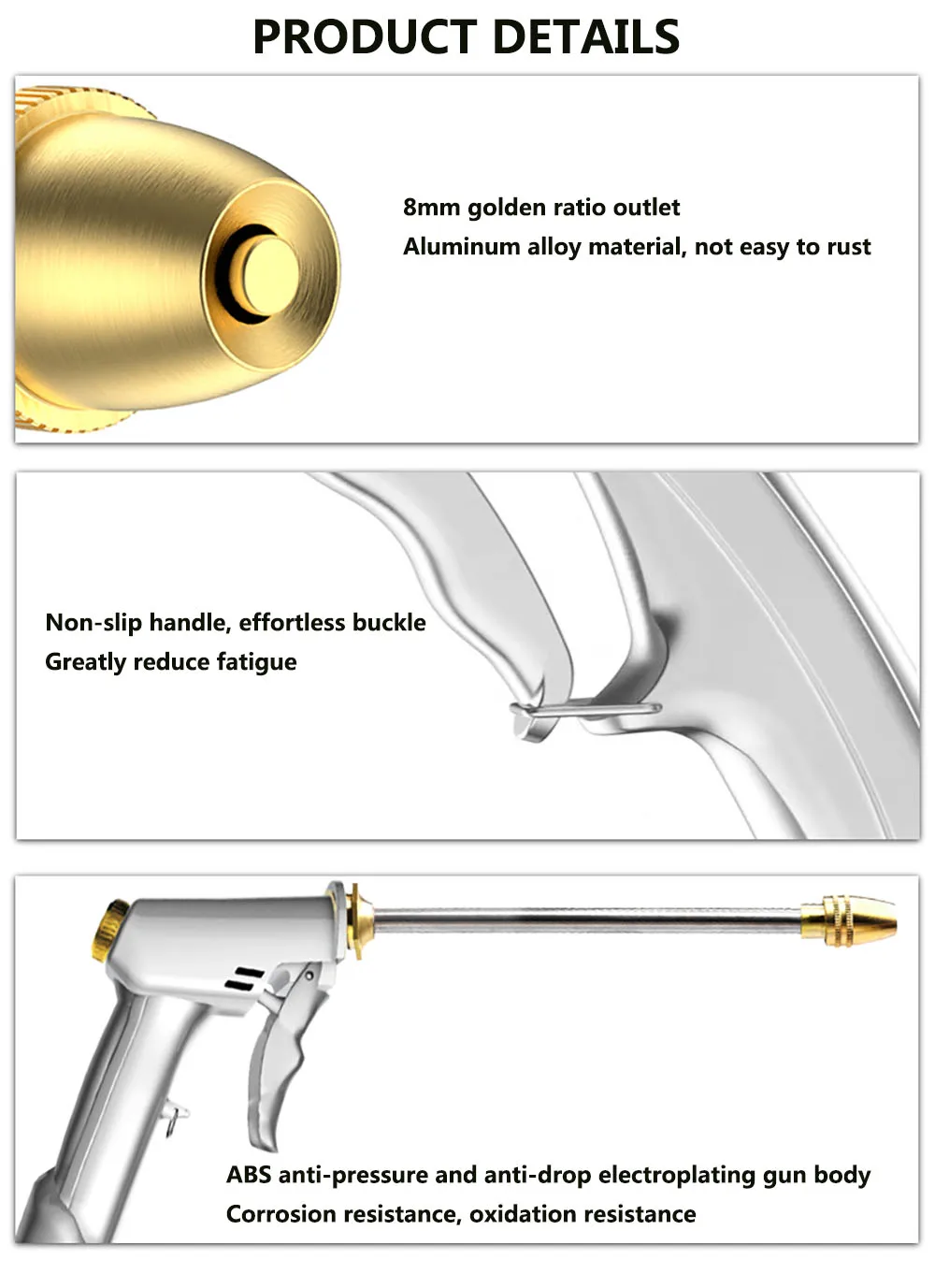 Название: шланг для мытья автомобиля/садовый водяной пистолет Материал: ✦Материал садового шланга: внутренняя труба из ТПЭ, полиэфирная плетеная муфта. ✦Материал водяного пистолета: медь, быстрый разъем из сплава, металлический корпус пистолета. Быстрый разъем: 3/4 дюйма Садовый водяной пистолет Размер: 26 см * 14 см (10,2*5,5 дюймов) Садовый водяной шланг Размер: 7,5 m (25FT): оригинальная длина 2,5 метров, и расширение 7,5 м после впрыска воды. 15 м (50 футов): оригинальная длина составляет 5 метров, а расширение-15 м после впрыска воды. 22 м (75 футов): оригинальная длина составляет 7 метров после впрыска воды, а прямая длина-22 м. 30 м (100 футов): после впрыска воды оригинальная длина составляет 10 метров, выпрямление 30 м.