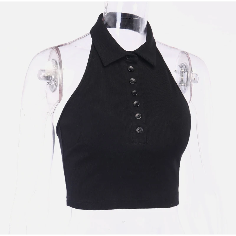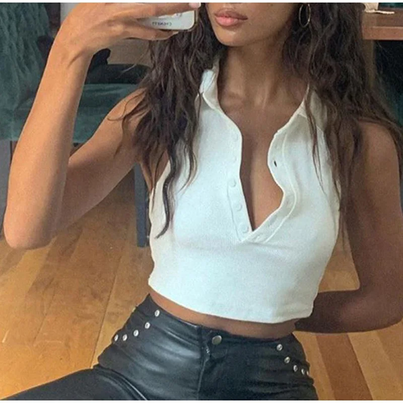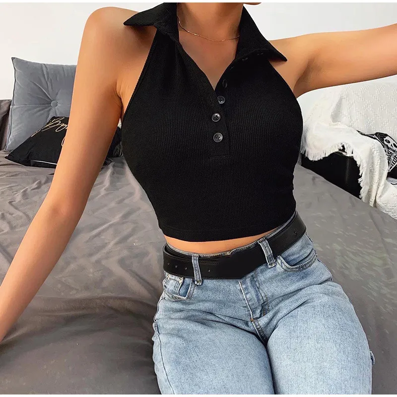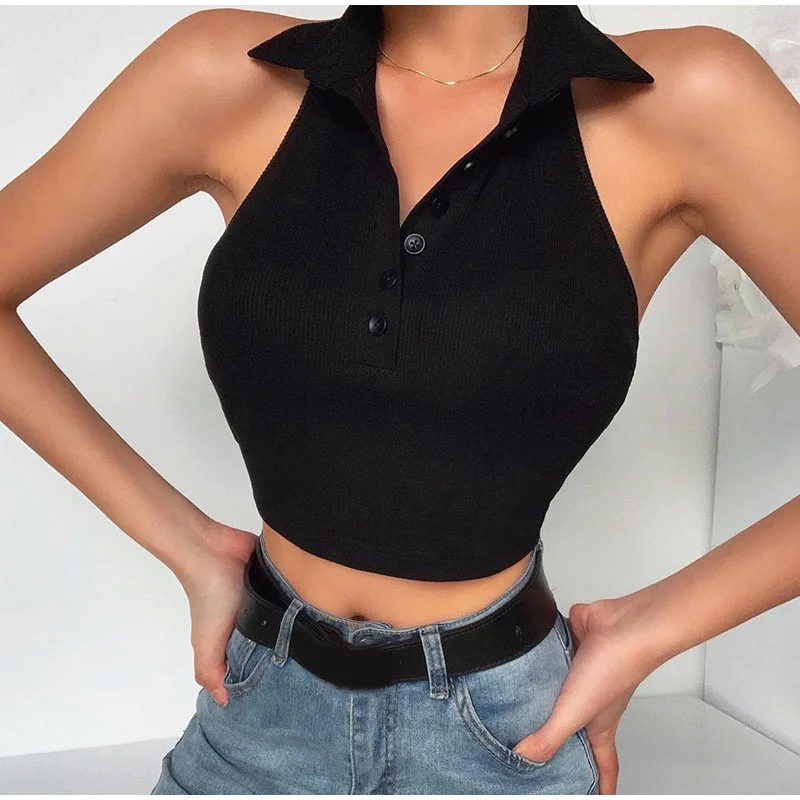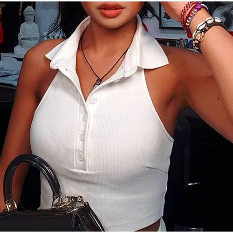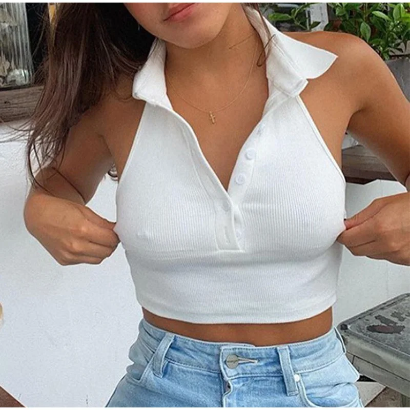 Сексуальный топ на бретелях, пикантная Женская одежда, короткий топ на бретельках с открытой спиной и пуговицами, белый укороченный топ, Ropa Mujer, лето 2020