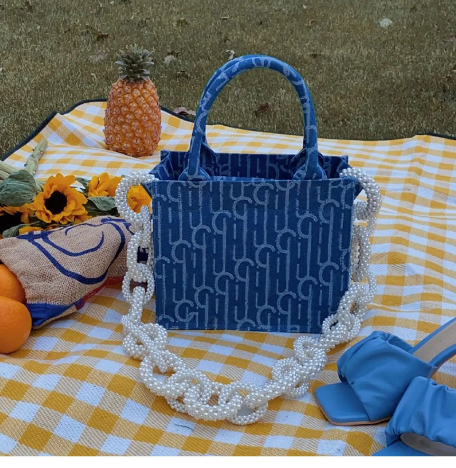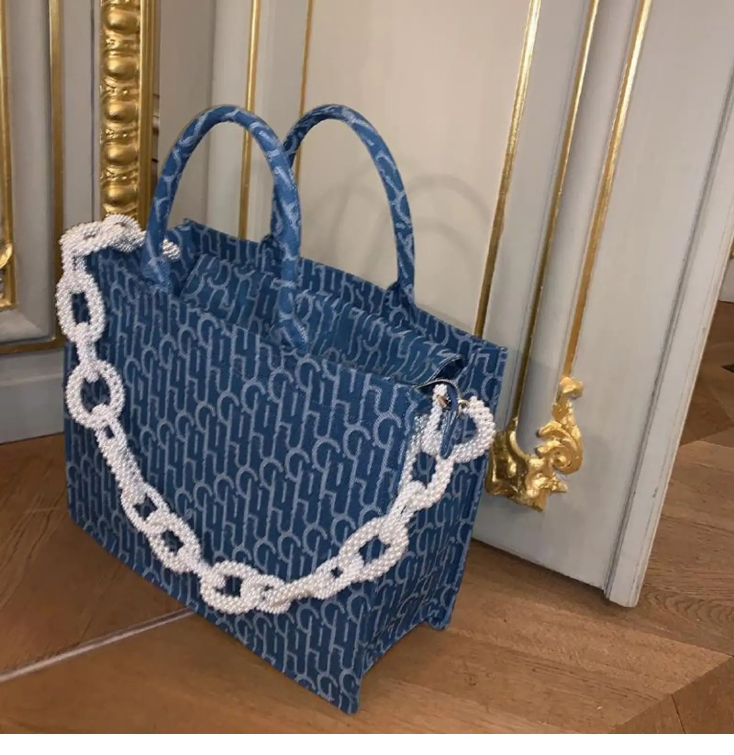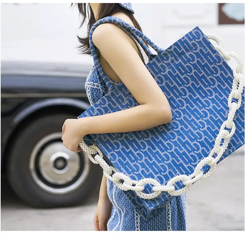 LW318 джинсовая сумка с жемчужным принтом на цепочке, Большая вместительная сумка-тоут, новинка 2020, женская сумка, Модный женский кошелек и сумки
