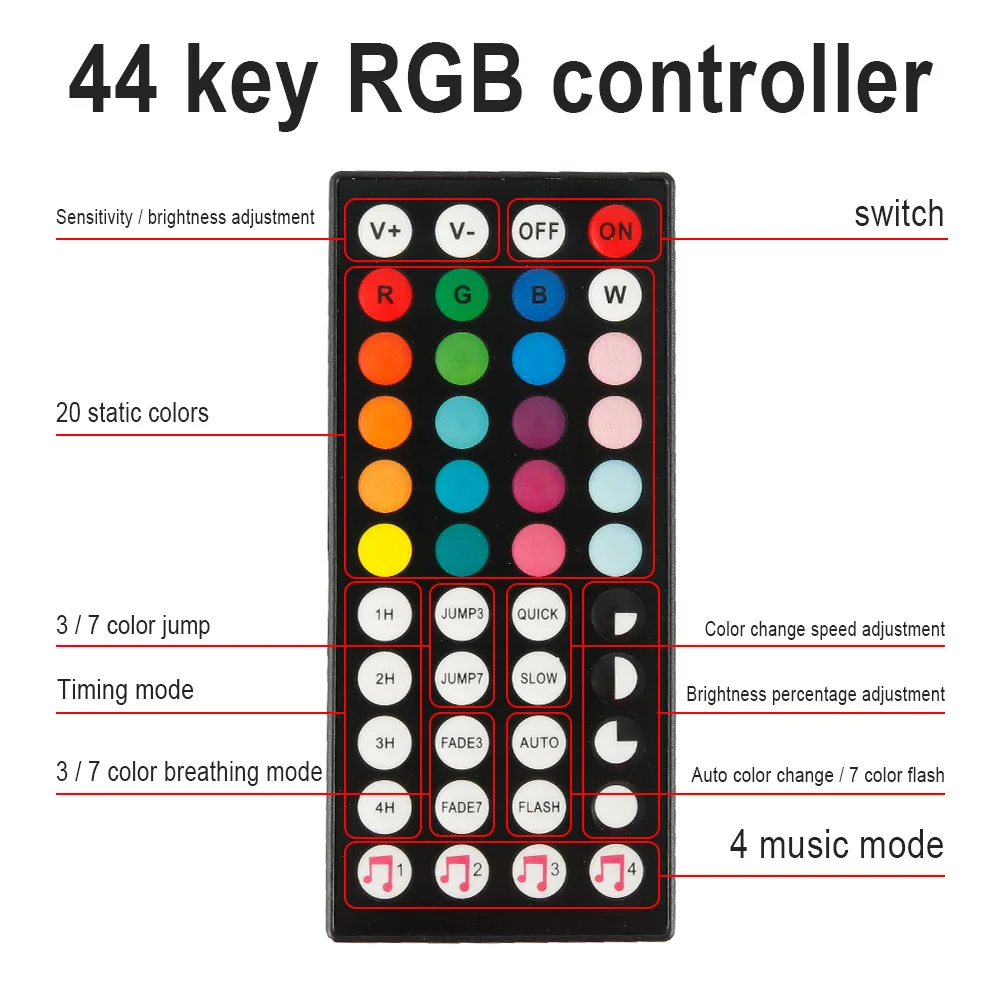*8 light color modes: fast/slow/auto/flash/ 7 color fade/ 3 color fade/ 7 color jump/ 3 color jump R/G/B increase/decrease control