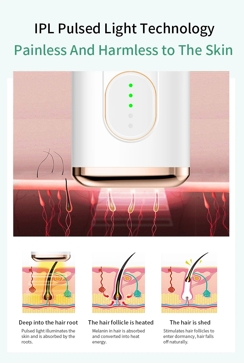 * IPL 500000 неограниченное количество импульсных вспышек; * Пять передач регулировки, энергия более точная. * Уход за волосами всего тела; Ноги, подмышки, бикини, руки, губы и т. Д. * Два режима вспышки: автоматическая модель вспышки для большого размера; Ручная модель вспышки для небольшой площади. * Безболезненный: пять регулируемых оптимальных уровней энергии в зависимости от толерантности кожи. Обеспечивает нежное лечение безболезненно и легко, не повреждая кожу. * Безопасность: не влияет на нормальное выделение пота и кожного сала