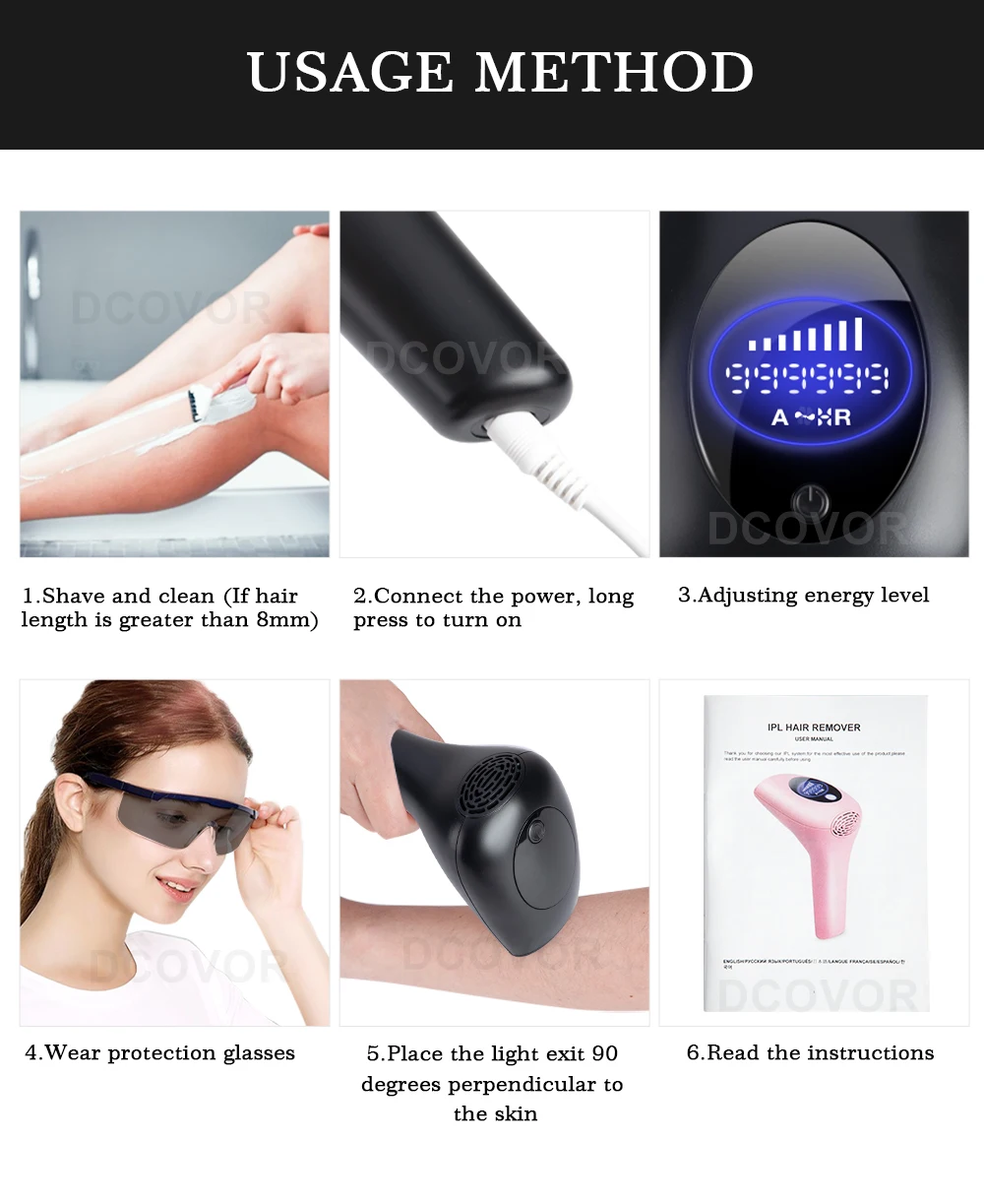 Tips: Please do not miss any unwanted hair, for thick unwanted hair (especially men hair, increase the repeated treatment as require to enhance effect. A pre-test from level 1 in a small area is suggested.
