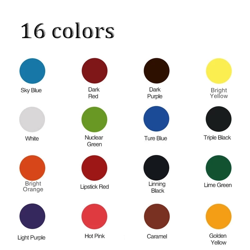 Ядерный зеленый, светло-фиолетовый, ярко-розовый, темно-красный, темно-фиолетовый, синий, карамельный, ярко-оранжевый, небесно-голубой, тройной черный