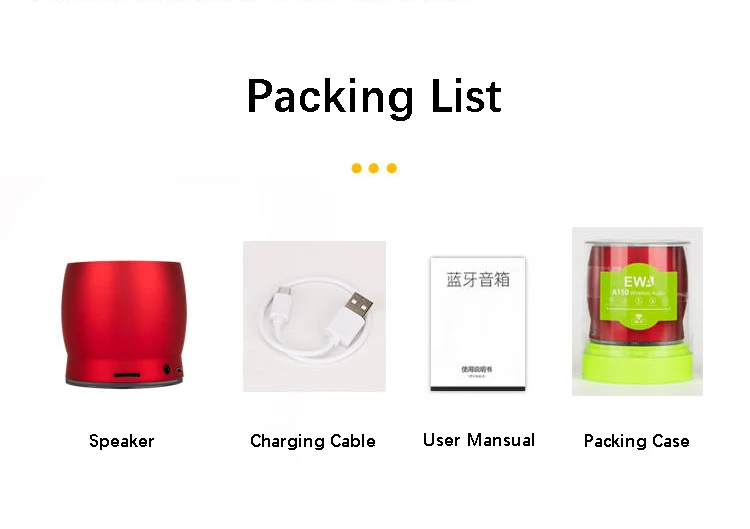 Динамик EWA A150 * 1 USB-кабель * 1 Руководство пользователя * 1 Гарантия качества 2 года Круглосуточное обслуживание клиентов и поддержка по электронной почте