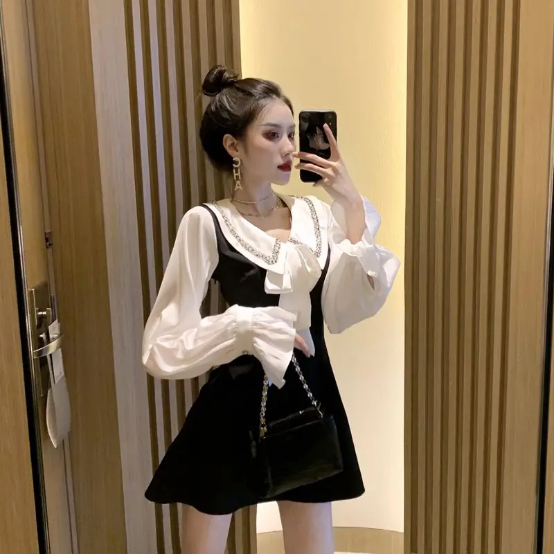 Наименование товара: Весенне-осеннее женское платье с длинными рукавами, новое модное милое платье трапециевидной формы с воротником Питер Пэн и высокой талией для женщин GD500