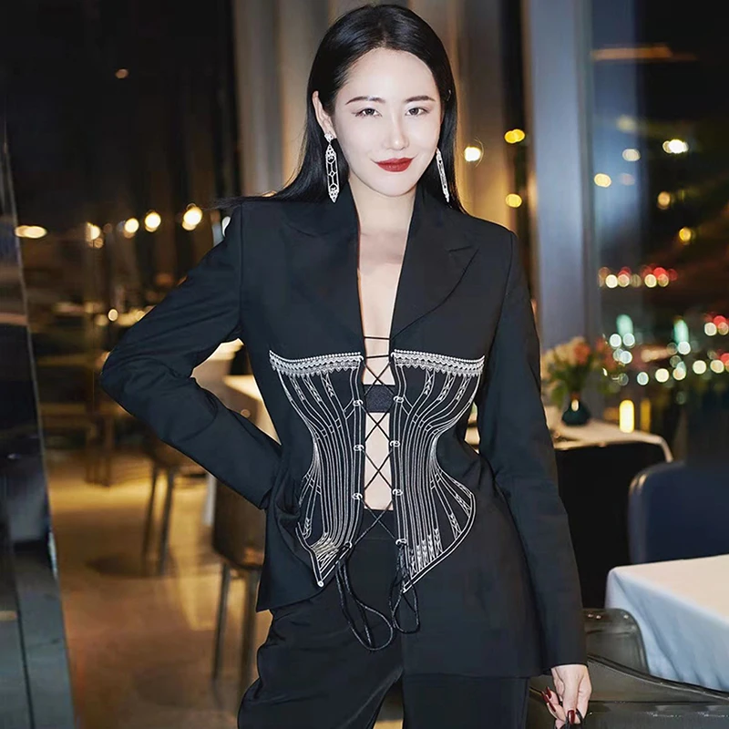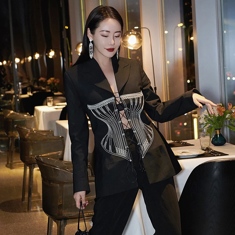 Женский костюм с длинным рукавом розовый двубортный треугольным вырезом