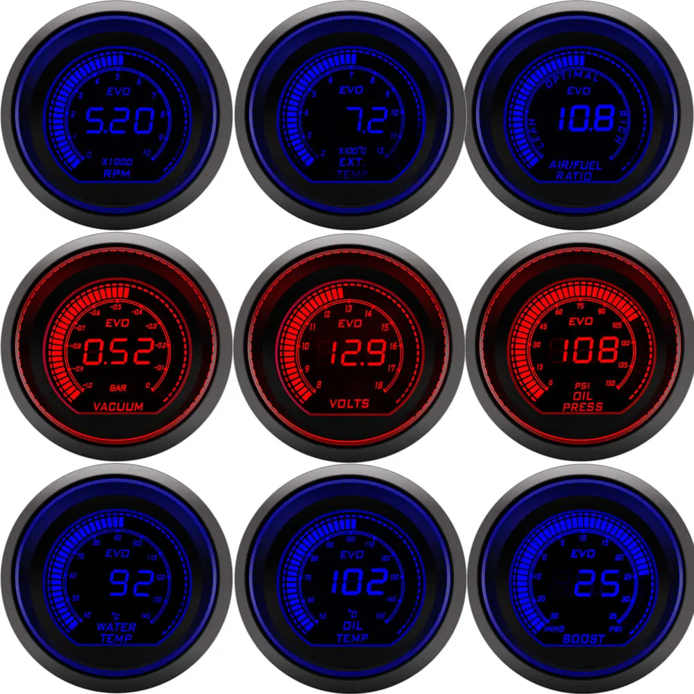 Цифровой 52 мм Автомобильный Тахометр rpm meter Boost температура воды Температура масла пресс вольт вакуум воздушный расход топлива Датчик EGT красный и синий двойной светодиодный