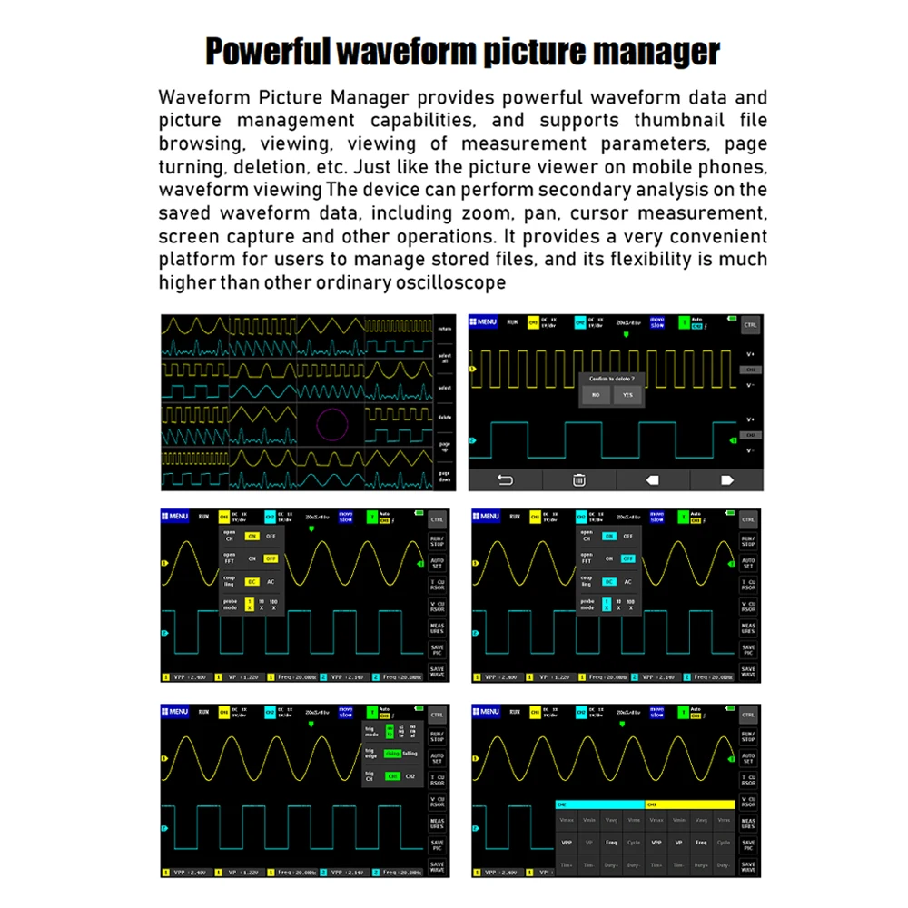 До 12 параметров измерения: VPP,VP,Vmax,Vmin,Vavg,Vrms, частые, Duty +,Duty-,Time +,Time-,Period.