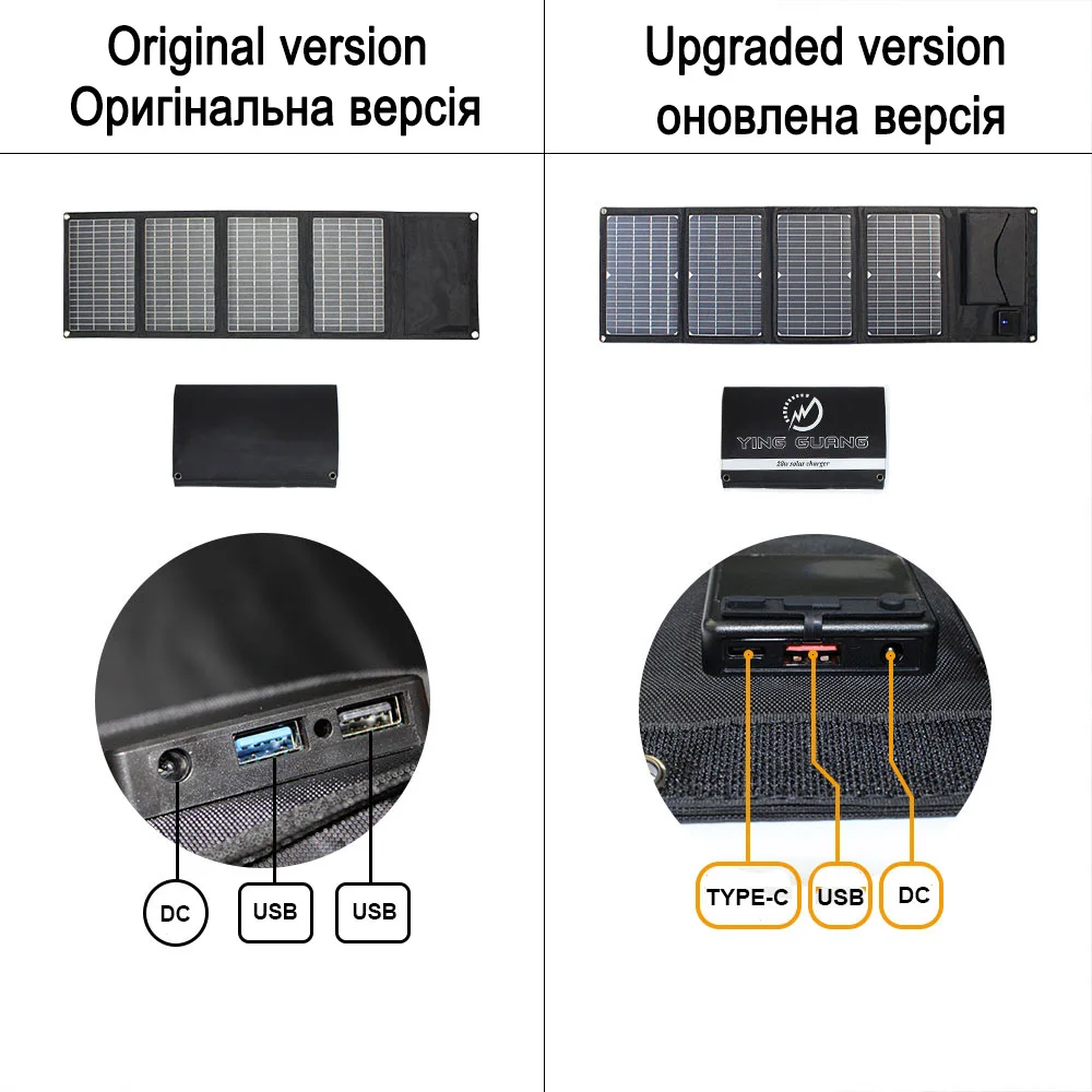 Мы модернизировали 28w складные солнечные панели. Новая складная солнечная панель имеет ту же мощность, что и оригинальная версия, только блок регулятора напряжения немного отличается. Новая версия 28w Складная солнечная панель может быть подключена к DC, USB и Type-C.