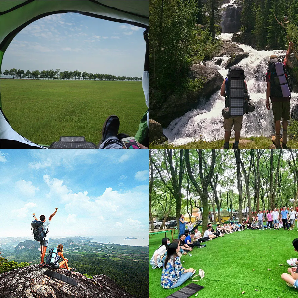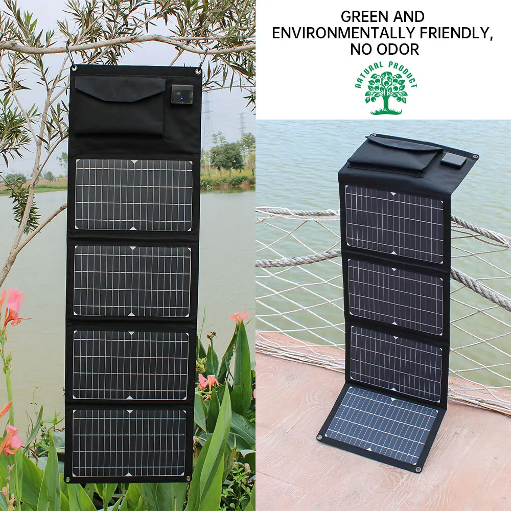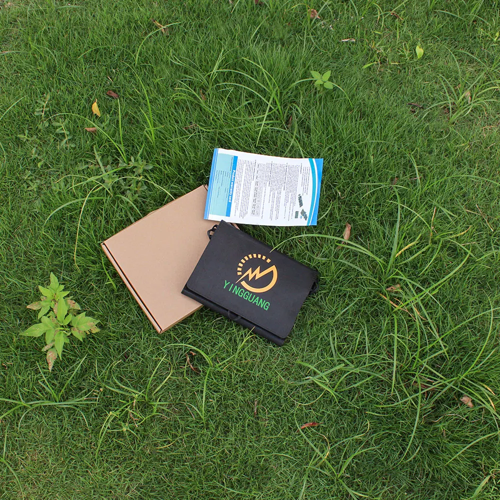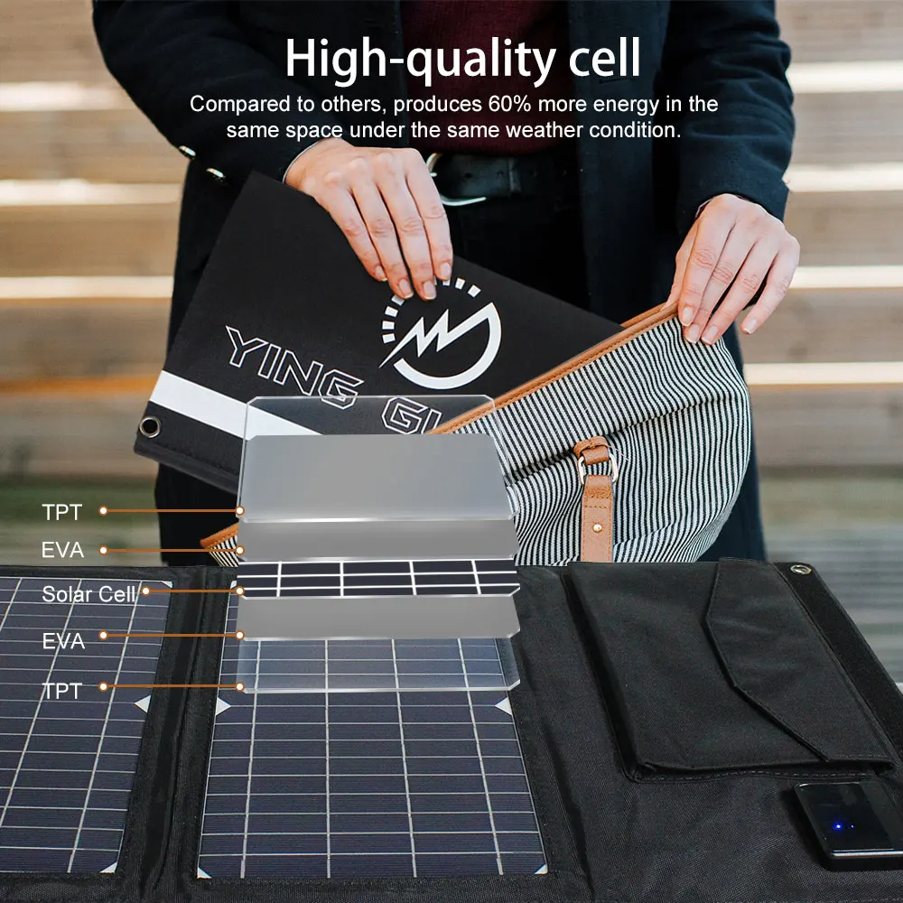 Портативный: как кошелек, легко брать. Складывается: компактный дизайн, маленький размер и максимальная выходная мощность при разворачивании. Прочный: Держите солнечную панель прямо на солнце, чтобы получить 100% выходную мощность. Легкий вес: Благодаря новейшим материалам и ламинированной технологии, наше складное зарядное устройство для солнечной панели является самой легкой складной солнечной панелью на рынке. Высокая эффективность: изготовлено из ПЭТ монокристаллических солнечных элементов до 21.5% эффективности.