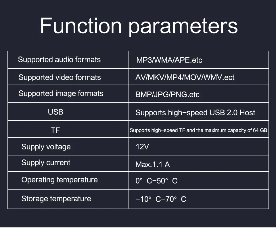 1.11.6 дюймов 1920*1080 HD IPS сенсорный экран 2. Система Android 9,0 3,64 битная ОС Android, 2 Гб RAM, мощная и Плавная обработка 4. Стекло H2.5D Память 5,16 ГБ ROM, расширение памяти: до 128 ГБ памяти USB и TF-карта 6. Встроенный беспроводной доступ в Интернет WLMA, поддерживает android APK 7. Поддерживает Miracast и Airplay 8,200 логотипа автомобиля и 20 брендов автомобильного интерфейса на выбор 9. Универсальный дизайн подходит для всех автомобилей 10. Плавное воспроизведение видео 4K / 1080P 11. Встроенный динамик 12.FM-передатчик, стерео Bluetooth 13.AV вход: поддерживает связь с автомобильным хостом или цифровым тв 14. Вход и выход: поддерживает подключение 2 монитора с тем же экраном Характеристики: 1. Система: 64-битная Android 9,0 2. ЦП: 64-битная ОС Android RK3368, 8 ядер cortex-a53, основная частота 1,6 ГГц 3. ПЗУ: 16 Гб ОЗУ: 2 Гб 4. Дисплей: 11,6 дюймовый дисплей full HD IPS (1920*1080), 5. Емкостный сенсорный экран, поддерживает 5 точек касания 6. Многоформатное декодирование видео 1080P, включая аппаратное декодирование 1080P H265 7. Поддерживает Miracast и Airplay, он может отображать экран телефона или планшета на экране развлекательной системы заднего сиденья 8. Расширение хранилища: Поддержка USB, TF-карты большой емкости 128 ГБ 9. Интернет: встроенный беспроводной доступ в Интернет WLMA 10. Поддержка Интернет-приложений android, таких как QQ. WeChat. Браузер. Игры и другие приложения 11. Производительность декодирования видео: 1080P, 30 кадров в секунду, скорость передачи данных: 30 Мбит/с 12. Поддержка аудиоформатов: MP3, AMR, WMA, CDA, WAV, MIDI, RA 13. Поддержка форматов видео: 1080 p, mp4, RMVB, rm, FLV, Avi, MPG, mpeg, MKV, asf, WMV, Mpe, 3 gp, dat, vob, ts, tp, m4v13. 14. Поддержка форматов изображения: JPEG,BMP,PNG,TIFF,JIF 15. Разъем для наушников: стандартный интерфейс 3,5 мм 16. Поддержка fm-передатчика 17. Поддержка стерео с синими зубьями 18. У Supprt 2 scrren Miracast одинаковый экран 19. Аудио и видео вход: можно подключить к хост-системе автомобиля или цифровому ТВ 20.Вход и выход: поддерживает подключение 2 монитора с тем же экраном 21. Поддержка зеркала телефона на 2 монитора с 3 экранами одинакового экрана 22. Рабочее напряжение: 12 В постоянного тока 23. Рабочая температура: -20 ℃ ~ 60 ℃