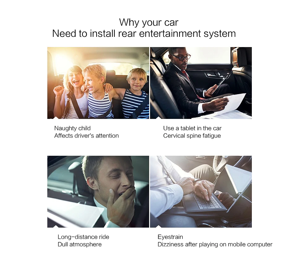 1x11,6-дюймовый монитор подголовника автомобиля 1x установочный кронштейн 10x аксессуары для установки 1x линия кабеля питания и линия питания сигареты 1x Меню пользователя на английском языке Посылка из 2 предметов: 2x11,6-дюймовый монитор подголовника автомобиля 2x установочный кронштейн 20x установочные аксессуары 2 шт. кабель питания& 1x линия питания от 1 до 2 сигарет 2x меню пользователя на английском языке Часто задаваемые вопросы:Вопрос 1: подходит ли монитор android 9,0 ко всем автомобилям?