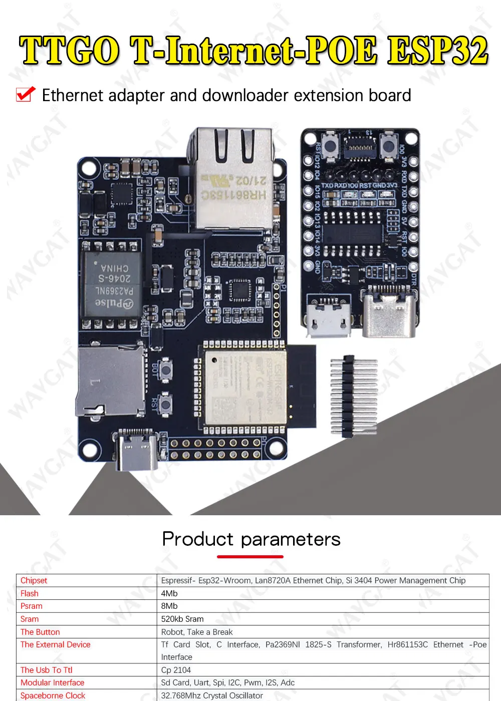 | Набор микросхем | ESPRESSIF-ESP32-WROVER-B,LAN8720A чип Ethernet, SI3404 чип управления питанием |