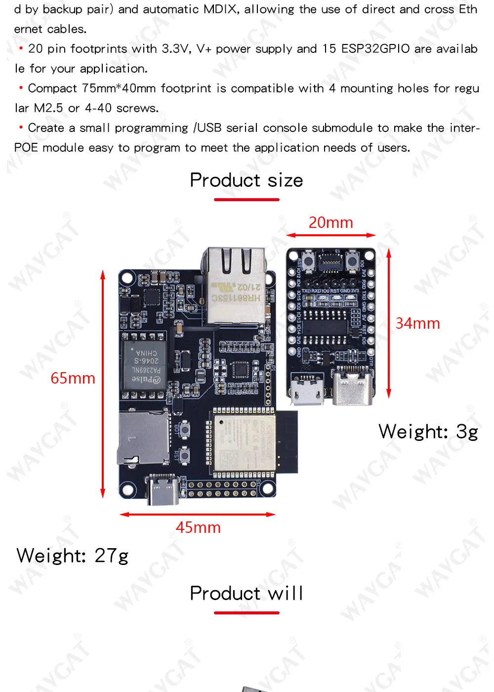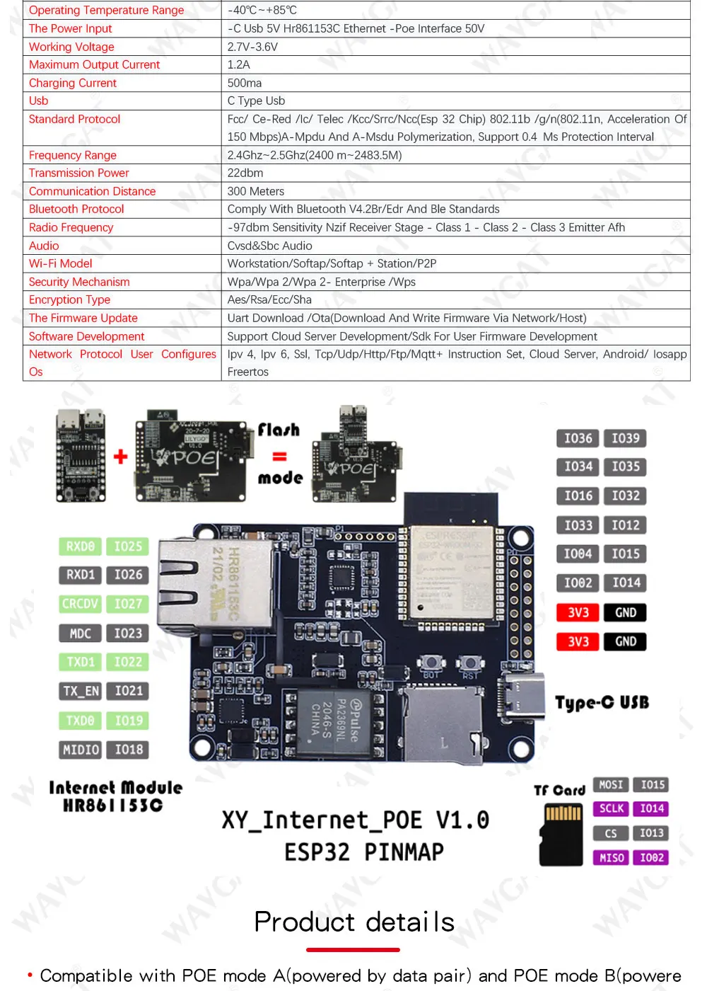 1. Совместимость с режимом PoE A (питание от пары данных) и режимом PoE B (питание от пары резервного копирования) и автоматическим MDIX, что позволяет использовать прямые и перекрещивающиеся кабели Ethernet.2,20 иглы след с 3,3 V, V + мощность и 15 ESP32GPIO доступны для вашего приложения.3. Компактный размер 75 мм на 40 мм совместим с 4 монтажными отверстиями обычных винтов M2.5 или 4-40.4. Небольшой программный/USB Серийный консольный модуль был создан так, что модуль Inter-POE может быть легко запрограммирован для удовлетворения потребностей приложения пользователя.Примечание: интерфейс USB имеет только функцию зарядки, продукт должен программировать загрузчик.
