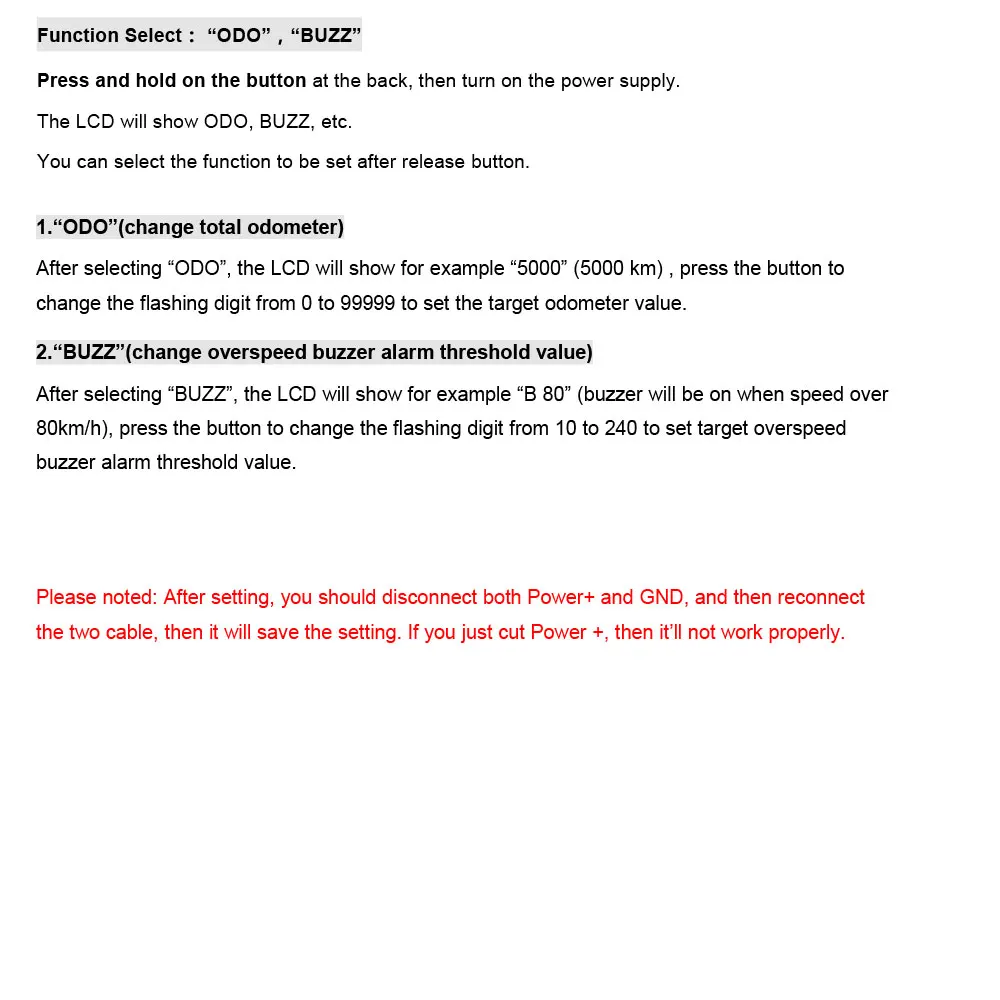 После выбора "BUZZ", например, ЖК-дисплей будет отображать "B 80" (зуммер будет включен, когда скорость более 80 км/ч), нажмите кнопку, чтобы изменить мигающую цифру от 10 до 240, чтобы настроить пороговое значение сигнала тревоги превышения скорости.