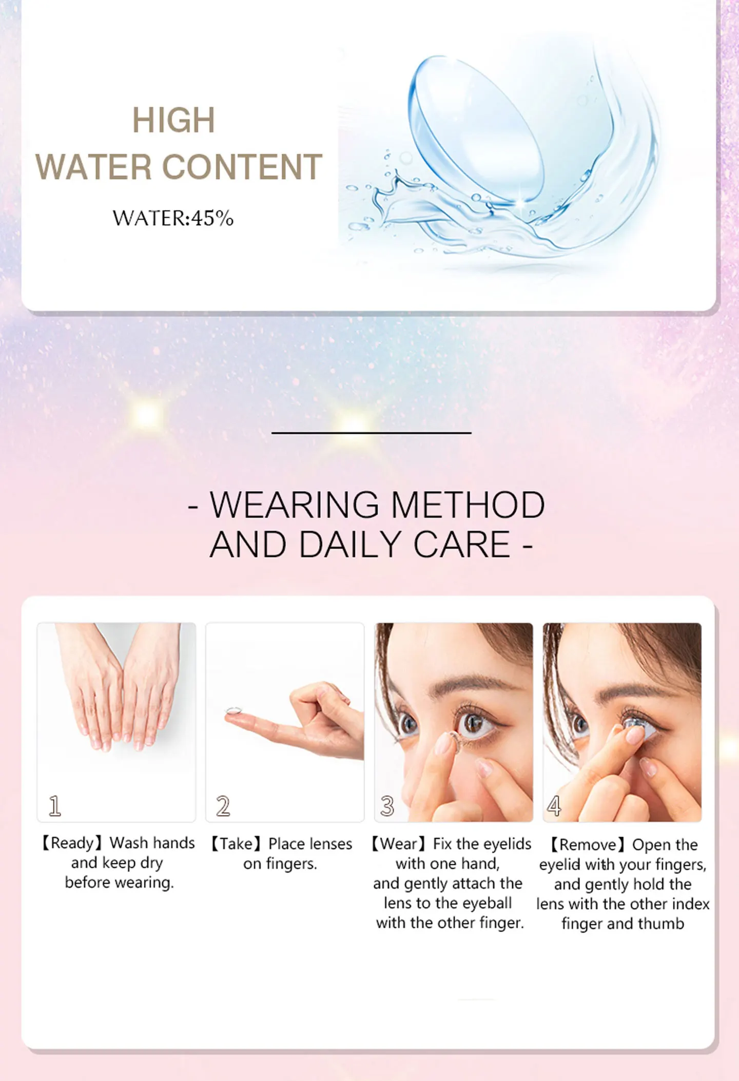 Толщина центра: 0,028 мм Основание кривое: 8,6 мм Диаметр: 14,0 мм Материал линз: хема/силиконовый гидрогель Мощность объектива: 0-800 Посылка: 1 пара (2 шт.) контактных линз