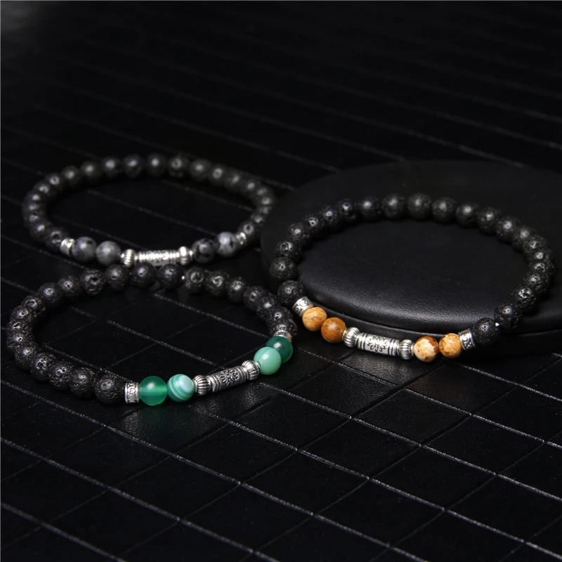 6 мм черные бусины из лавы, браслеты для мужчин, Винтажный серебряный цвет, лотос, подвеска в виде трубочки, Pulsera, Женский амулет, буддизм, молитва, ювелирное изделие