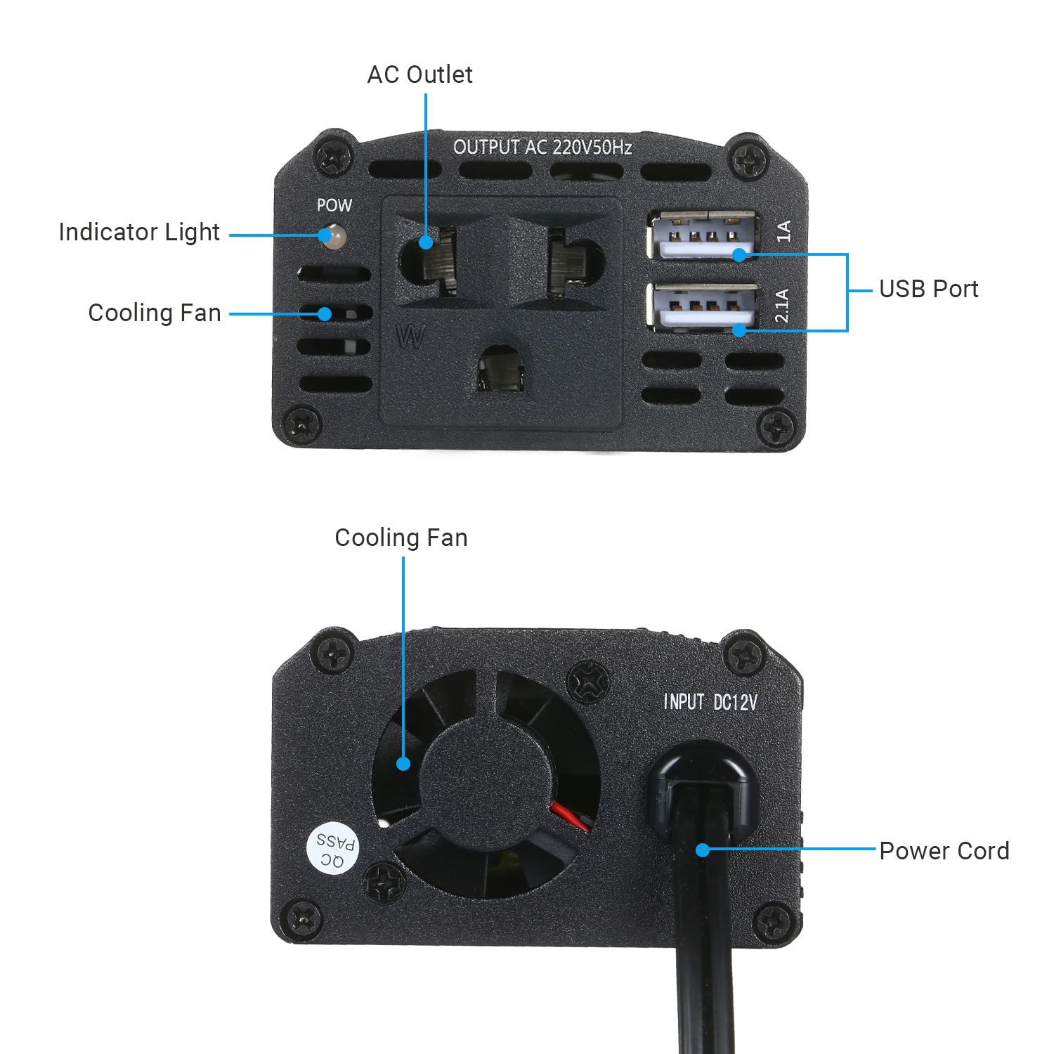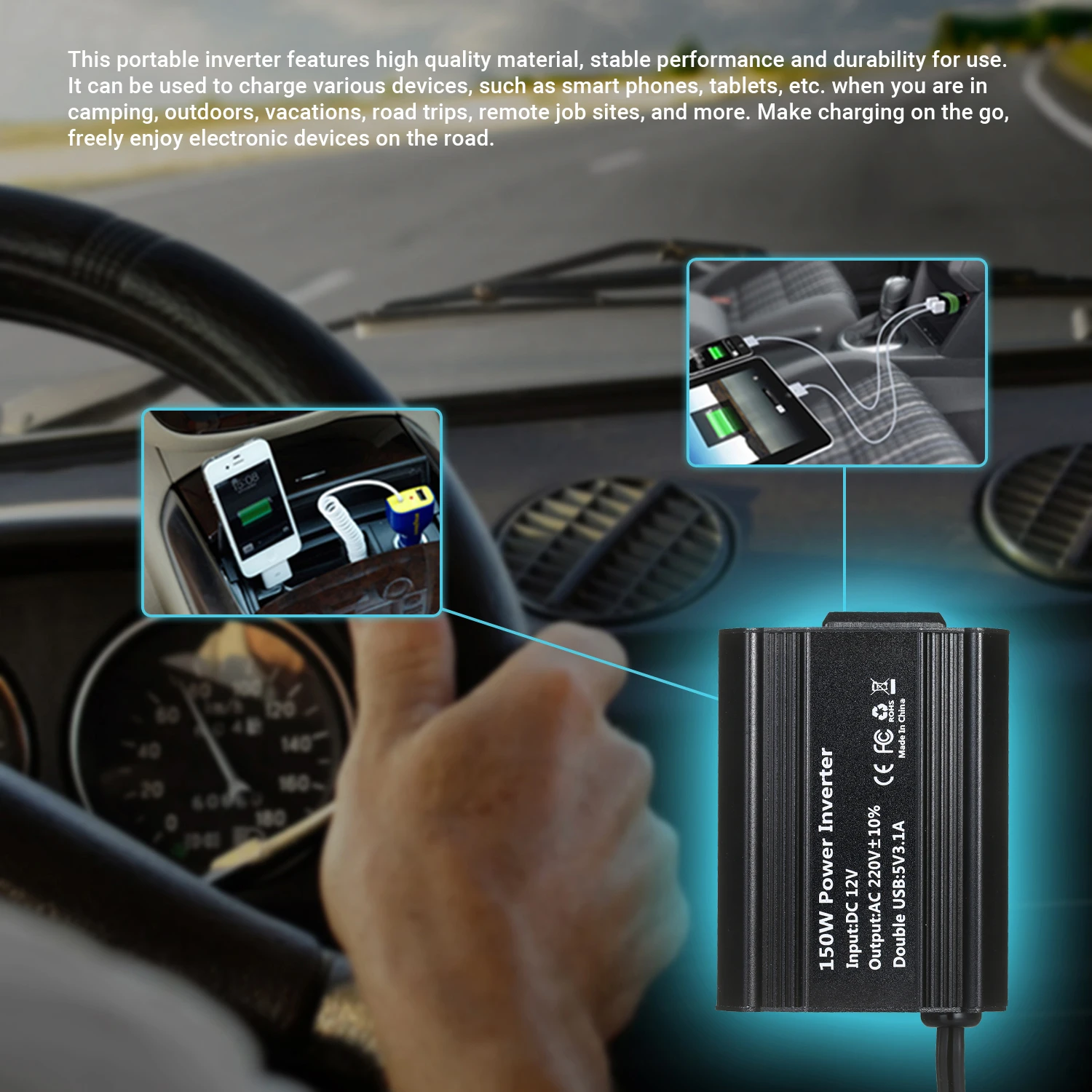 Функция:Этот инвертор мощностью 150 Вт способен преобразовывать 12 В постоянного тока в 220 В переменного тока.