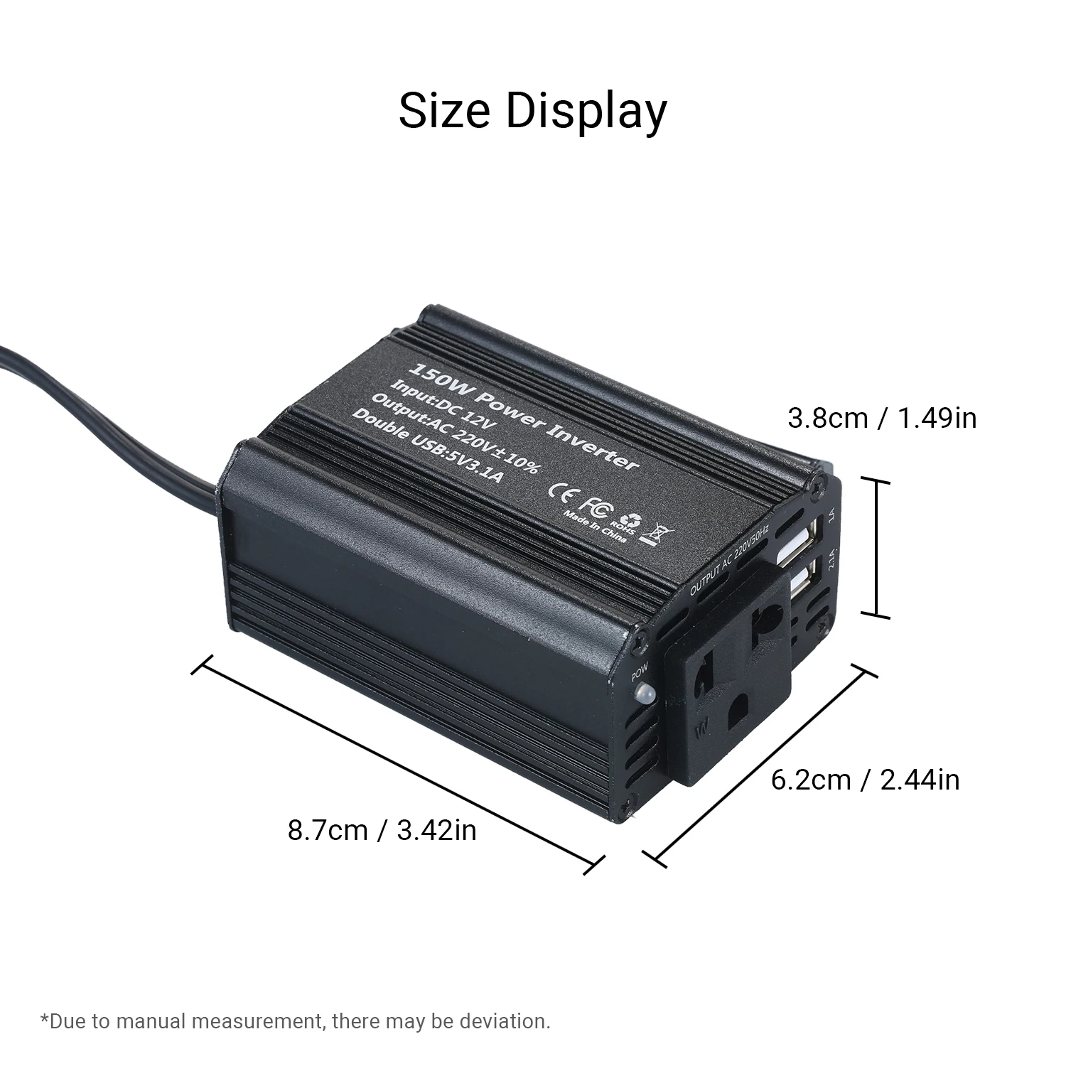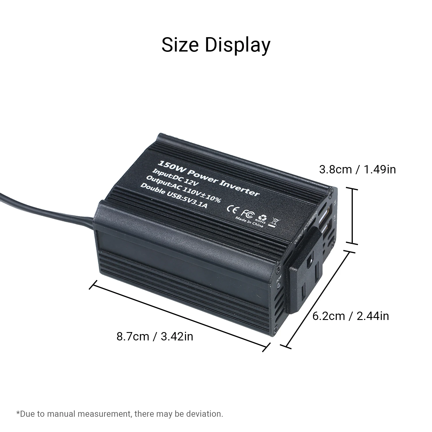 Компактный и портативный:Легкий инвертор, только в том случае, 7,61 унций, поставляется в 8,7*6,2*3,8 см удобный размер, легко носить с собой.