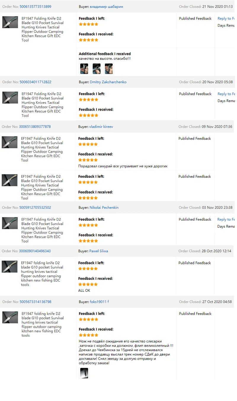 Магазина Knives Online Store работает с 09.07.2016. его рейтинг составлет 96.09 баллов из 100. В избранное добавили 6660 покупателя. Средний рейтинг торваров продавца 4.8 в продаже представленно 187 наименований товаров, успешно доставлено 10607 заказов. 3605 покупателей оставили отзывы о продавце.