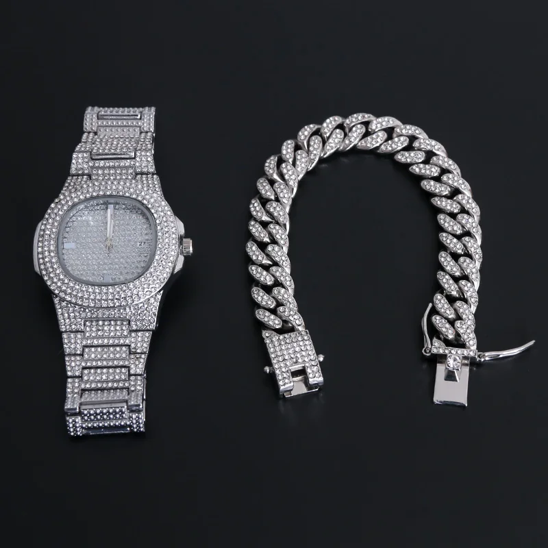 Золотое ожерелье + часы + браслет в стиле хип-хоп Miami кубинская цепочка со льдом, Стразы CZ Bling Rapper для Мужчин, Ювелирные изделия, Новинка
