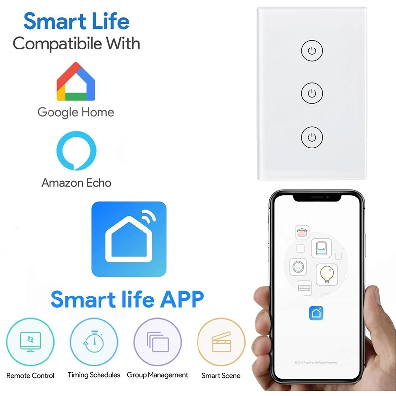 Описание продукта: Бренд: mivolvo Модель: US-WIFI-2way-123 Количество каналов управления: 1/2/3 Характеристики: переключатель с двойным управлением для спальни и лестницы Применимое Расположение: двойной контроль коридора лестницы для спальни Умное управление: WIFI сетевое подключение мобильное приложение умное управление Поддержка радиочастотного дистанционного управления: беспроводной пульт дистанционного управления RF433 эффективное расстояние 20 м (пульт дистанционного управления необходимо приобретать отдельно) Пульт дистанционного управления Wi-Fi: включение/выключение света из любого места Поддержка приложений: Бесплатное мобильное приложение iOS и Android (Smart Life) Совместимость: используется с Amazon Alexa Google Home Независимое управление: Управляйте каждой группой отдельно Состояние синхронизации: состояние устройства в режиме реального времени предоставляется в приложении Время: установите заказ/таймер обратного отсчета для открытия/закрытия в указанное время Материал корпуса: огнестойкий материал ABS Сенсорная панель: закаленное стекло Механический срок службы: 100000 следующий Питание: AC110V-240V Максимальная мощность: 800 Вт/комплект Размер: 120*72*35 мм