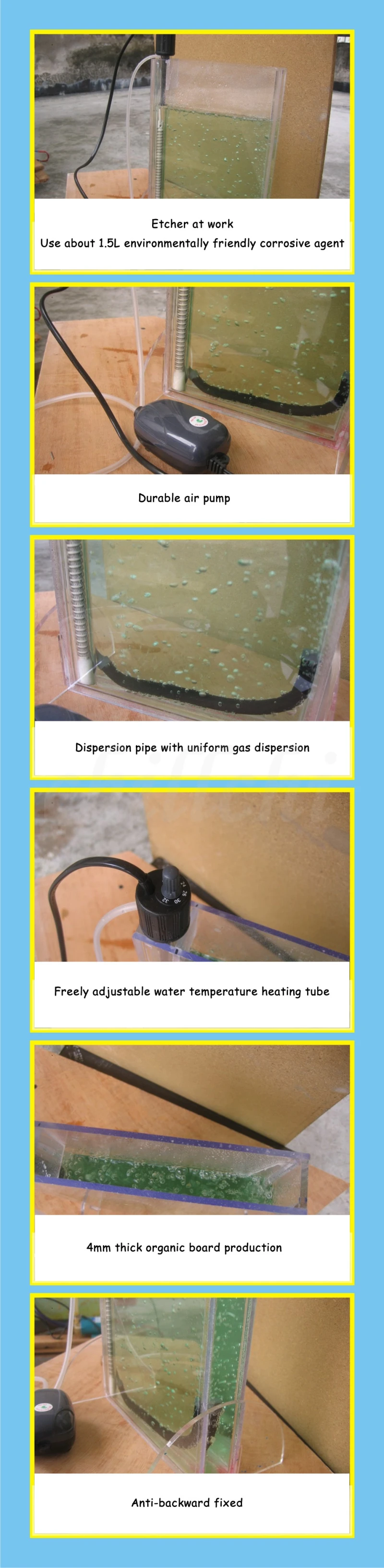 Название: новое поколение, охрана окружающей среды, энергосбережение, быстрая, машина для травления печатной платы Характеристики: быстрая, Экологически чистая, энергосберегающая Функция: автоматический контроль температуры. Воздушная мешалка. Площадь платы: может вместить 150*200 мм поверхность платы Упаковка: одна 4 мм Органическая доска коробка, Один воздушный насос, Одна прозрачная трахея, Один диффузор, Одна нагревательная трубка.