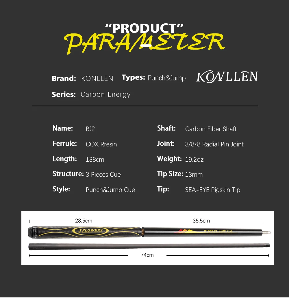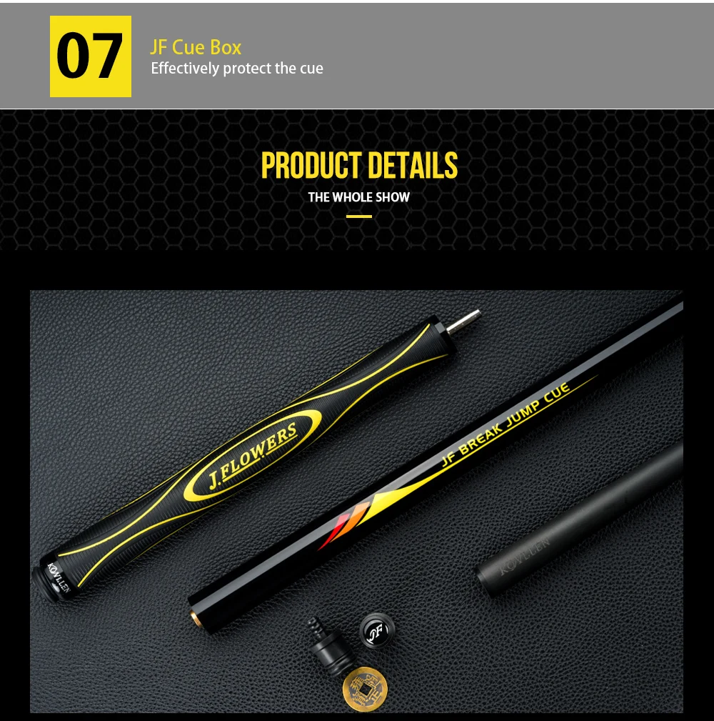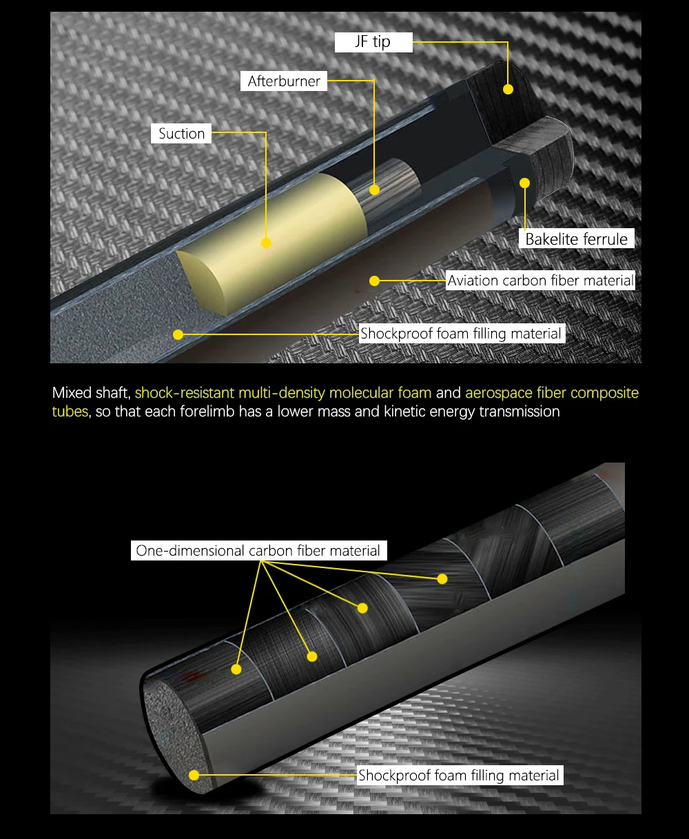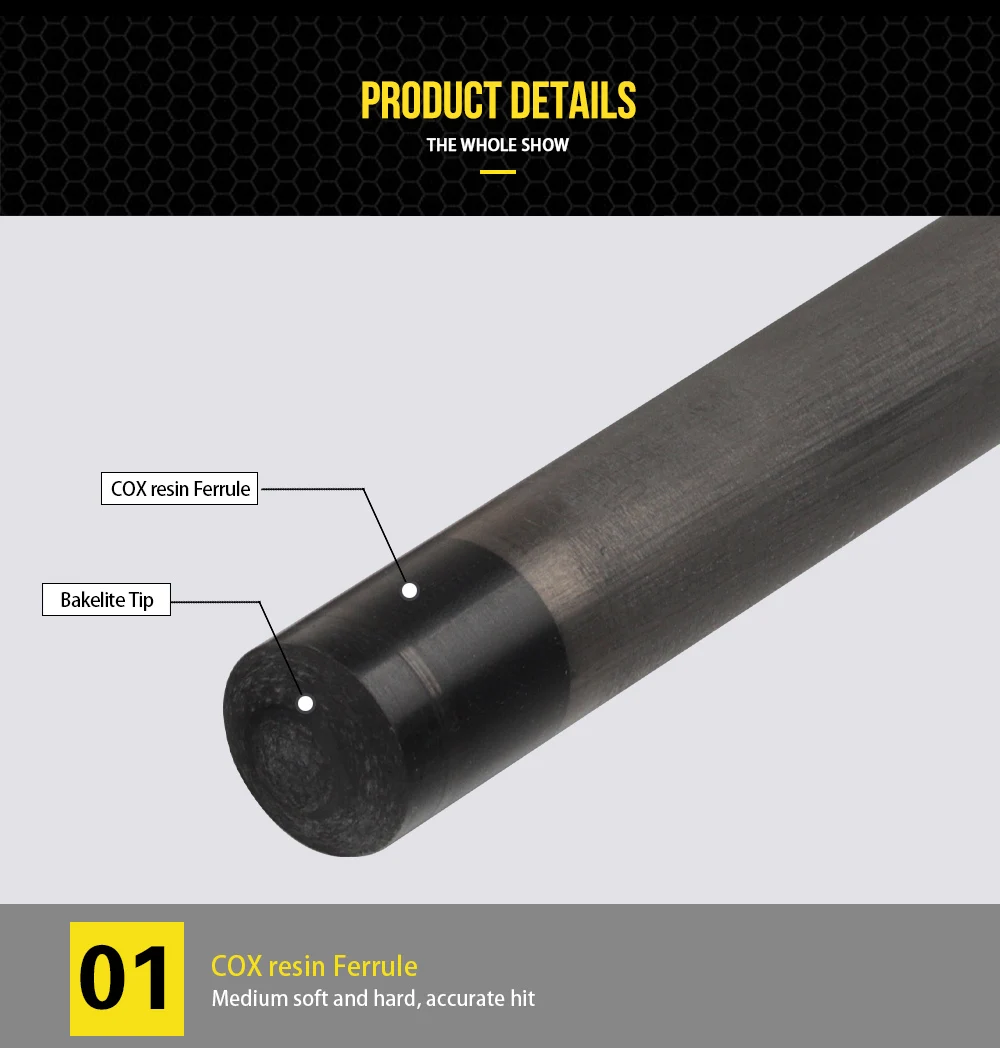 В основе черной технологии используется аэрокосмический чистый углеродный волокнистый композитный материал, внешний вид-углеродный черный, полая структура делает вал легче, но углеродное волокно может быть более мощным, чем твердое дерево cue