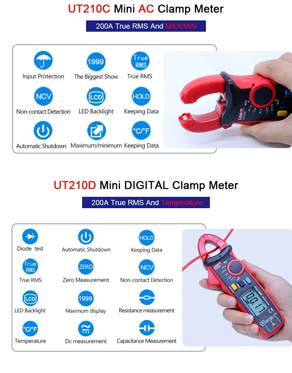 UT210E от UNI-T-это мини 100A True RMS Автоматический диапазон цифровой клещи с 2000 счетом дисплея и функцией VFC. Удобно использовать в узком пространстве.